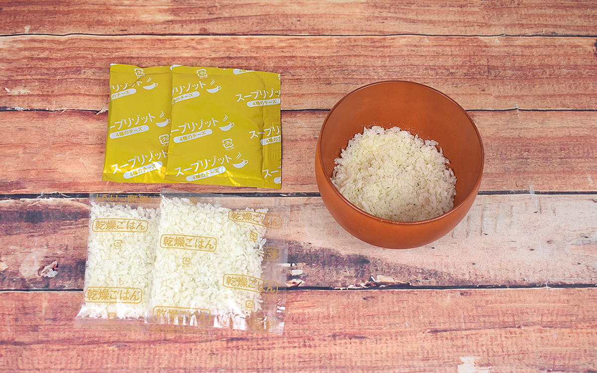 1個で3食分入っている同商品。パッケージを開けると、「乾燥ごはん(アルファ化米)」&「スープリゾットの素」が3袋ずつ入っていました。作り方は簡単で、器に「乾燥ごはん」と「スープリゾットの素」をそれぞれ1袋開け、上から熱湯を160ml注ぐだけ。お湯の量は自由に調整しても良いため、自分好みのとろっと食感に仕上げられます。
