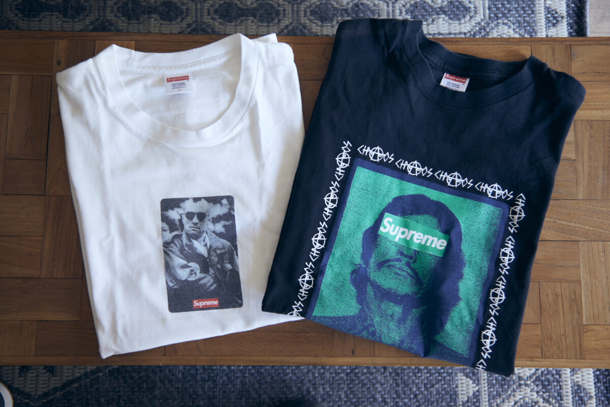 宮戸 左はシュプリームの20周年を記念したアニーバーサリーモデルです。シュプリーム第1号店がアメリカ・ニューヨークにできた当時、最初に発売されたTシャツの再販モデルです。映画タクシードライバーには僕もかなり影響を受けましたし、特別な一枚ですね。そして右は、WTAPSのディレクターである西山徹氏がデザインしたTシャツで、明確にいうとシュプリームとのコラボモデルでは無いのです。2008年にリリースされたもので、中古品を購入しました。チャールズ・ブロンソンとボックスロゴのコンビネーションが渋過ぎですね〜。