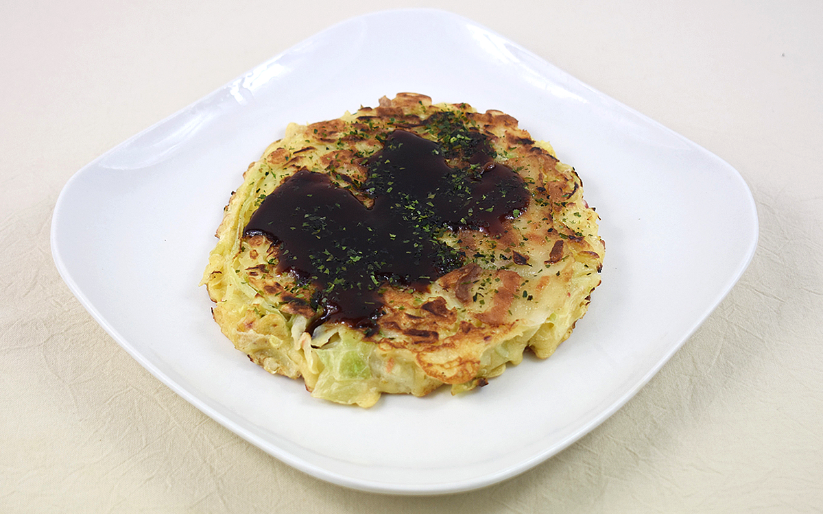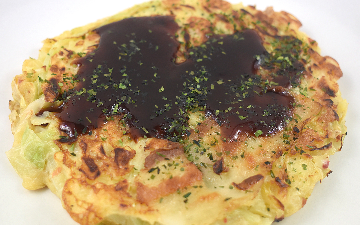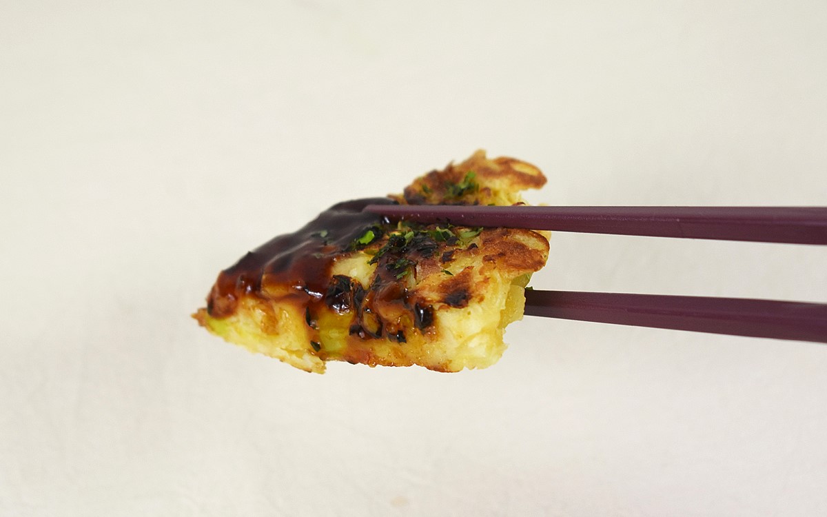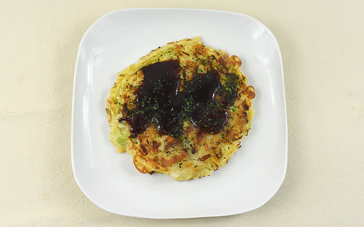 付属のソースと青のりをトッピングした後に、お好み焼きをひと口味見します。思ったよりも生地に弾力があり、ふわっとした食感。また、甘みを含んだソースとシャキシャキのキャベツが相性バツグンで、噛むたびにおいしさがアップしていきました。
