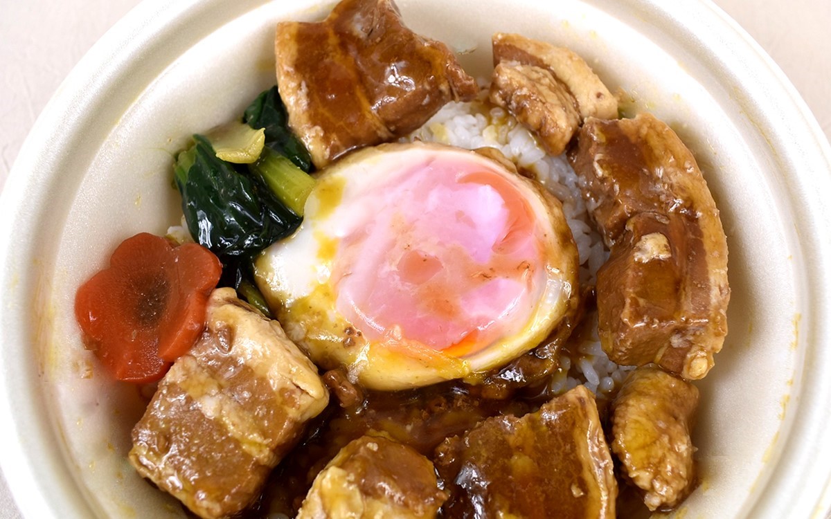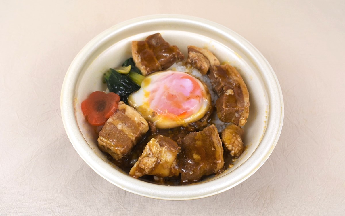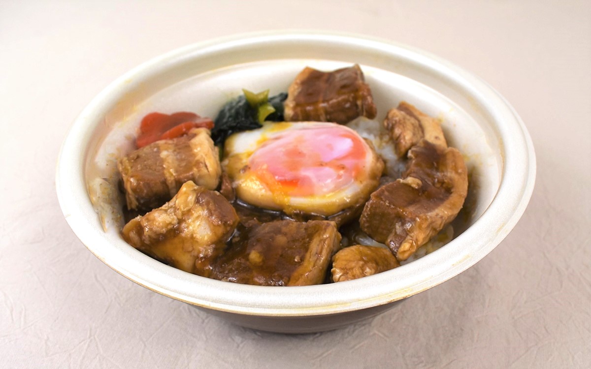 フタを開けると豚の角煮に加えて、半熟玉子や小松菜など具がてんこ盛り。特にメインの角煮は身が分厚く、食べごたえのある大きさです。お花型にカットされた人参も色鮮やかでキュート。南の地方らしさを感じさせる見た目の角煮丼に仕上がっていました。