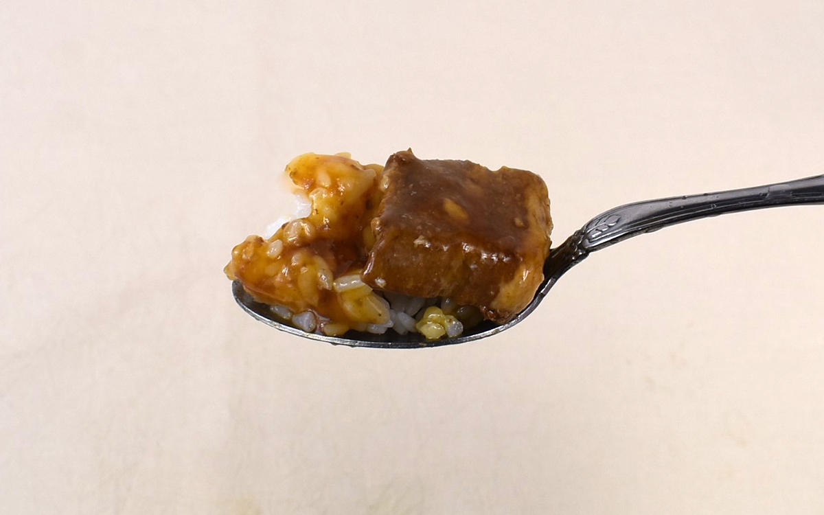 さっそく500Wの電子レンジで約2分50秒ほど温めると、黒糖&黒酢を隠し味に使ったたれの甘い香りがふわり。まずはメインの角煮からいただきます。
