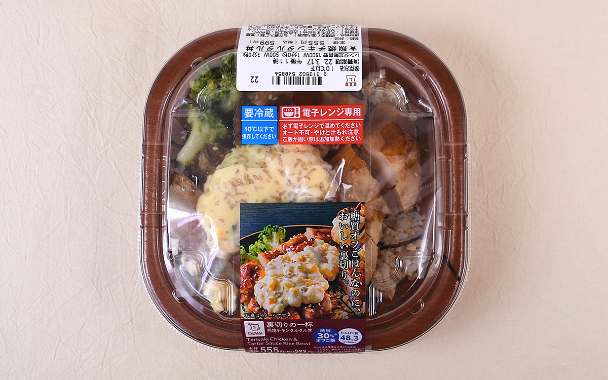 これまでにも低糖質の麺系商品を販売してきたローソンの“裏切りの一杯”シリーズ。今回はタルタルソースをかけたとりの照り焼きがメインの一品で、ポイントはもち麦入りごはんと大豆そぼろ炒めを使用しているところです。パッケージには「糖質オフごはんなのに、おいしい裏切り」という記述もあるため、ヘルシー商品とは思えない食べごたえを期待できそう。
