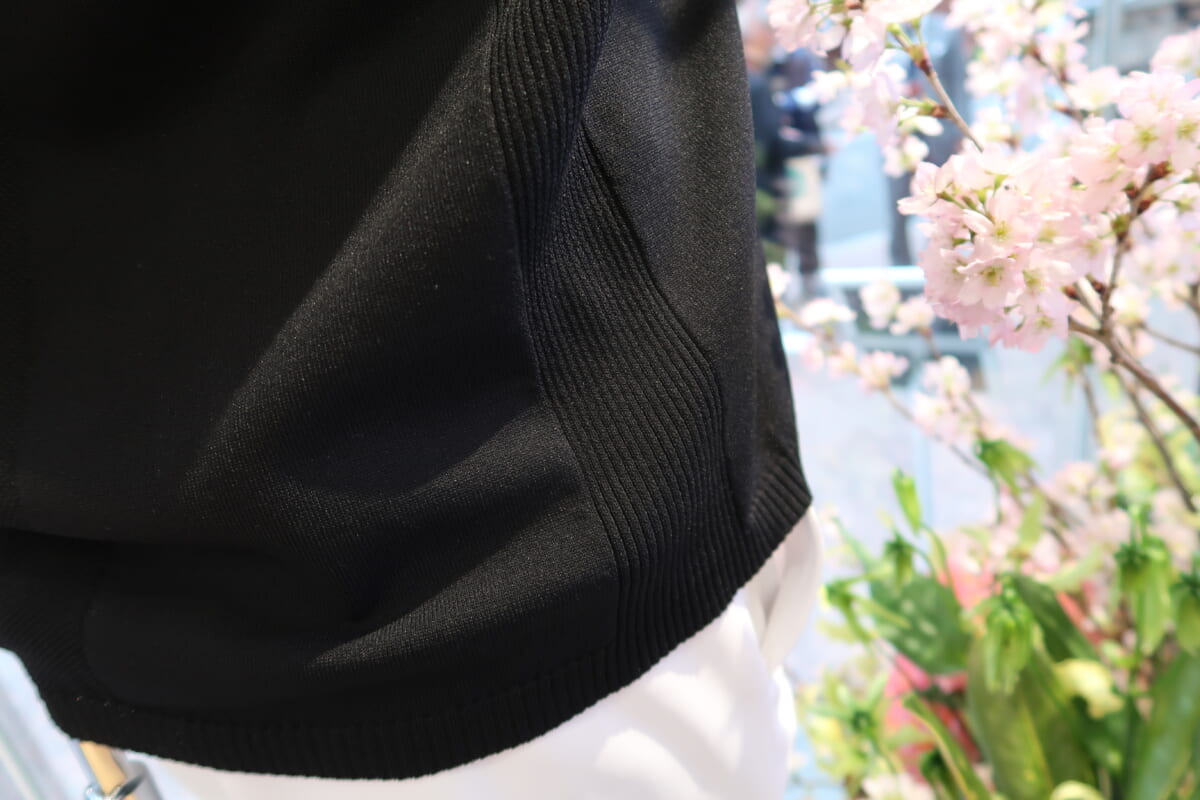 若者向けのENVOY(エンボイ)ラインからは、「SUNSCREEN&FUSION MOVEテープロゴプリント半袖シャツ」(1万6500円)を紹介します。太陽光を反射して衣服内の温度上昇を抑えるサンスクリーン機能と、運動パフォーマンスを向上させるパターン設計のフュージョンムーブを採用。特徴的なのが、肩の部分に縫製がない1枚布で仕上がっていること。肩の動きを邪魔せず、違和感を払拭させて快適なスイングを実現します。