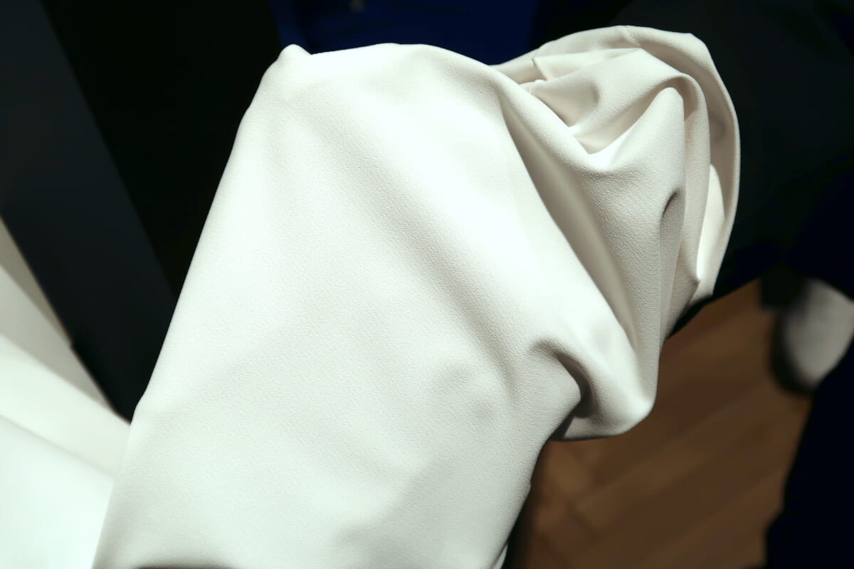 次はロングパンツです。夏は熱を反射する白色の服を着たいけど、白いパンツは下着が透けるから格好悪いと、これまで避けてきた人も多いのではないでしょうか。そんなニーズに応えるのが、「神白ボトム」(2万900円)。透けにくい素材を使用しているのと同時に、キープクリーン加工により汚れも落ちやすい。きれいな白のまま着続けることができます。もちろん、ストレッチ性、吸汗速乾、衣服内の温度上昇を抑えるUPF50+のUVケア機能付き。