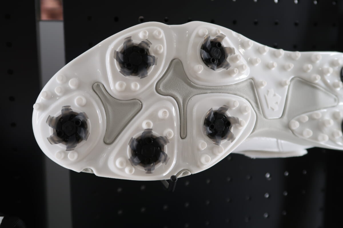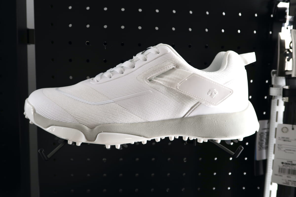 個人的にはコウノエベルトを搭載した「BMZスパイク ゴルフシューズ」(2万5300円)に注目しています。スポーツトレーナーの鴻江寿治氏が開発したコウノエベルトは、身体の歪みや故障を解消させ、身体本来のポテンシャルを引き出すと言われています。このベルトをシューズに採用することで、足をしっかり固定し、指先が開いて指全体で地面を捉えることができるとのこと。ゴルフコースは起伏が激しく、しっかり踏ん張らないと安定したショットが打てません。筆者のようなフェアウエイキープ率が低いアベレージゴルファーにぴったりではないでしょうか。アウトソールには遮熱・断熱素材のGAINAを採用、夏場の芝生から上がってくる熱をシャットアウトし、シューズ内の温度上昇を抑えます。