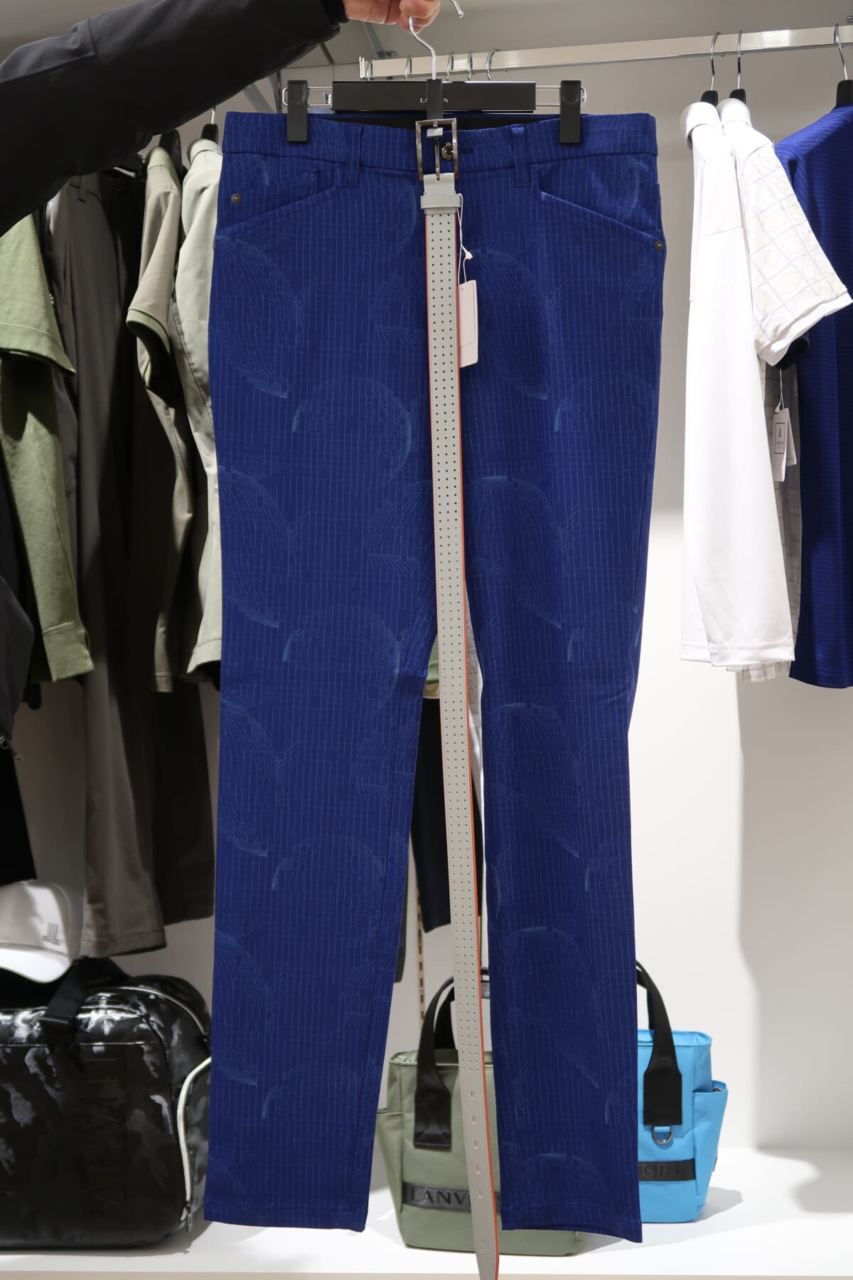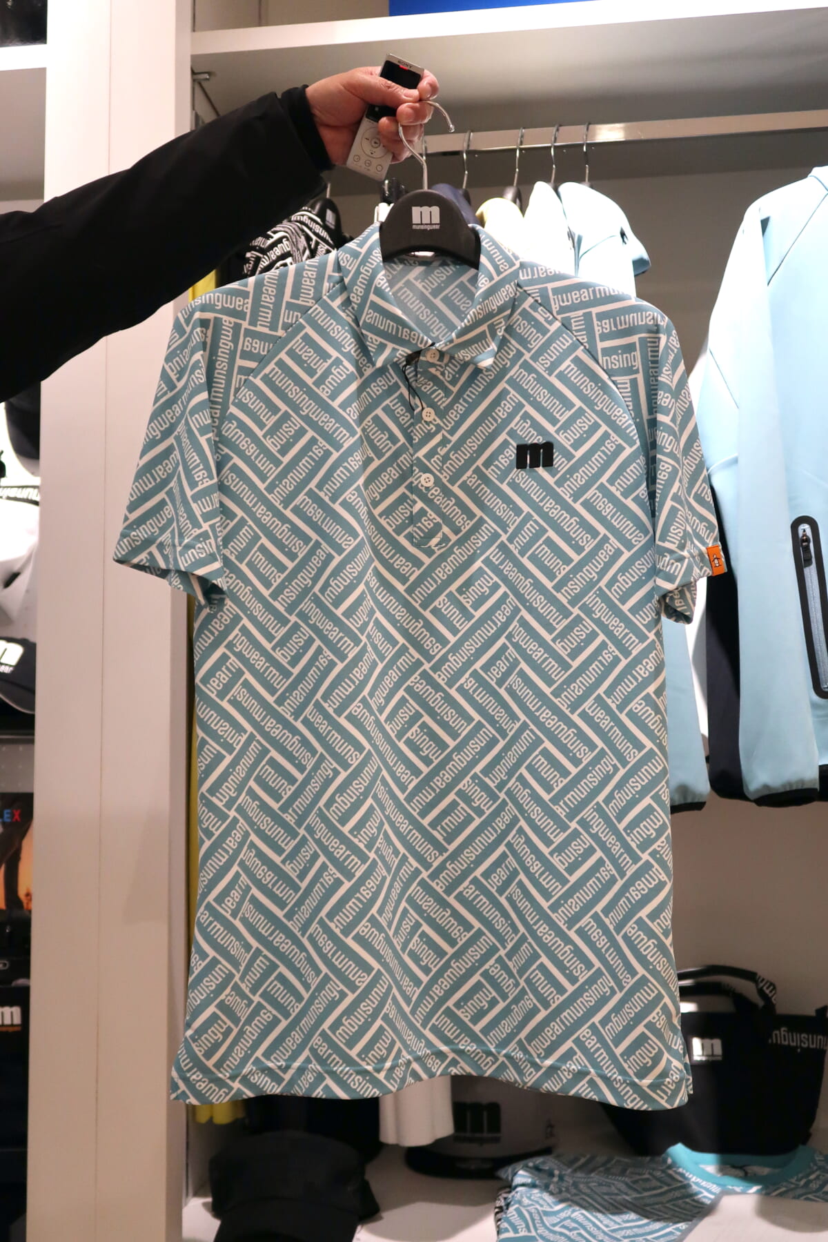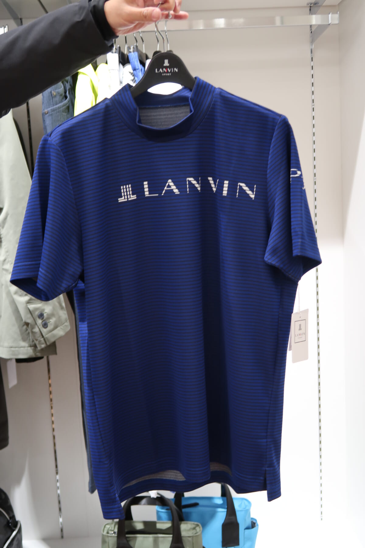 2階にはランバン スポール、マンシングウェア、ルコックスポルティフ ゴルフのメンズコレクションが並んでいます。まずはランバンから。ランバンはパリ発のファッション性とスポーティーさを兼ね備えたブランドですが、2022SSのイチオシアイテムの一つが「半袖モックネックシャツ」。ジャガード生地を採用したボーダー柄で、シンプルだけど清涼感にあふれるデザインになっています。価格は2万4200円。カラーは、ブルーとホワイトのボーダー柄の2色展開。