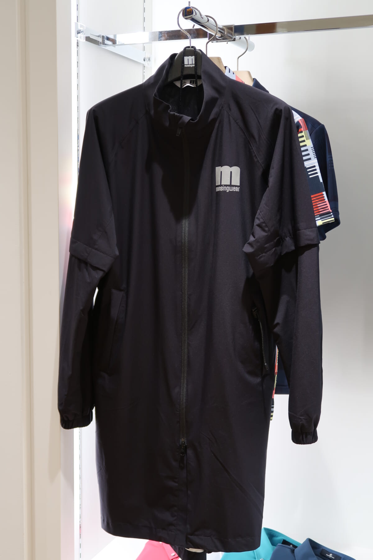 最大の目玉が、おそらくゴルフ業界初のメンズレインコート。多くのメーカーがレディースではレインコートをラインアップしているものの、メンズはパンツとセットのレインウエアのみ。しかし、雨の日にレインパンツを穿きたくないと思っているゴルファーは多いです。動きにくいし、蒸れるし、昼食時に脱いだり履いたりするのが本当に面倒。そうした声に応えるべく、今年初めて投入するのがこのメンズ用ロングレインコートです。