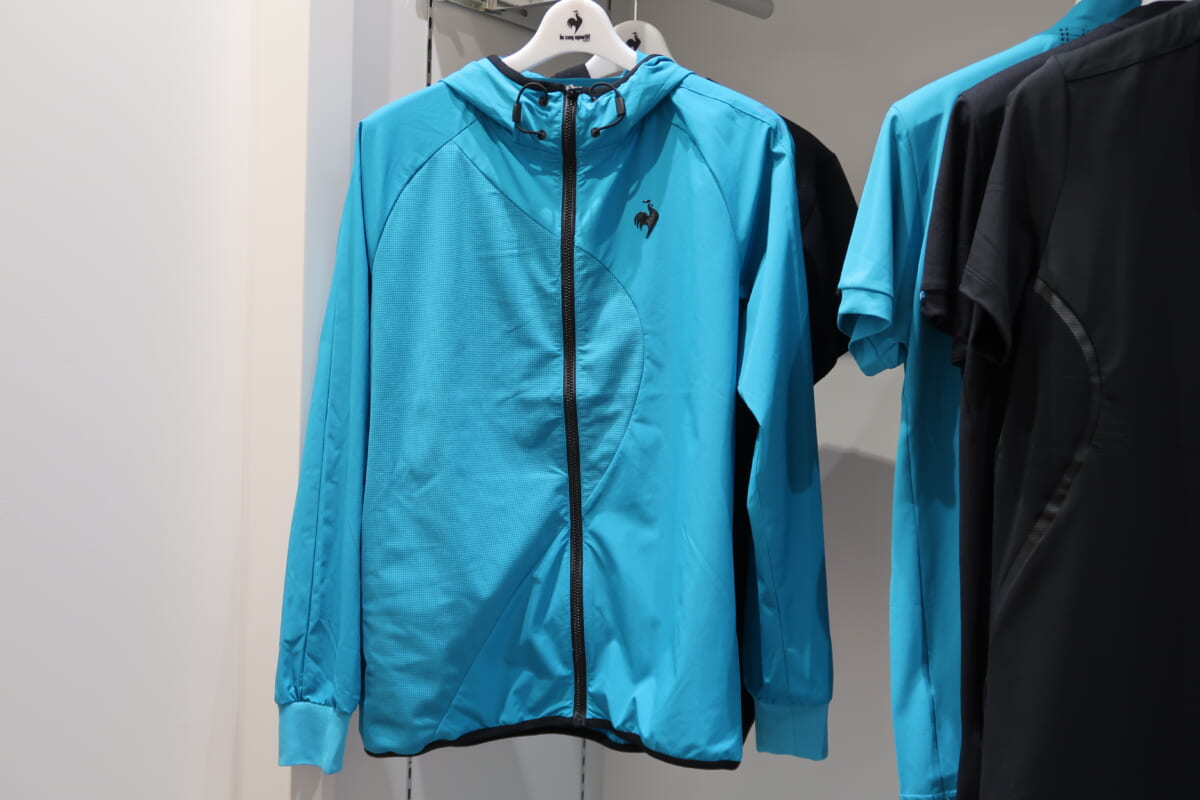 最後に、ルコックスポルティフ ゴルフの【RIJOUME】コレクション。シャープでスタイリッシュなアスリートスタイルに、同ブランドの洒落た柄使いや印象的なマーキング、遊び心のあるデザインをプラス。仕事もゴルフも生活も喜びに溢れた、豊かな人生を送る大人に向けたアイテムを展開しています。ひとつめが「ストレッチフルジップブルゾン」。2つの同色異素材を曲線で組み合わせることでスタイリッシュさとスポーティーさを演出しています。独特のロゴは異色異素材を使うことで、さり気なく目立つ工夫をしています。価格は1万7600円。