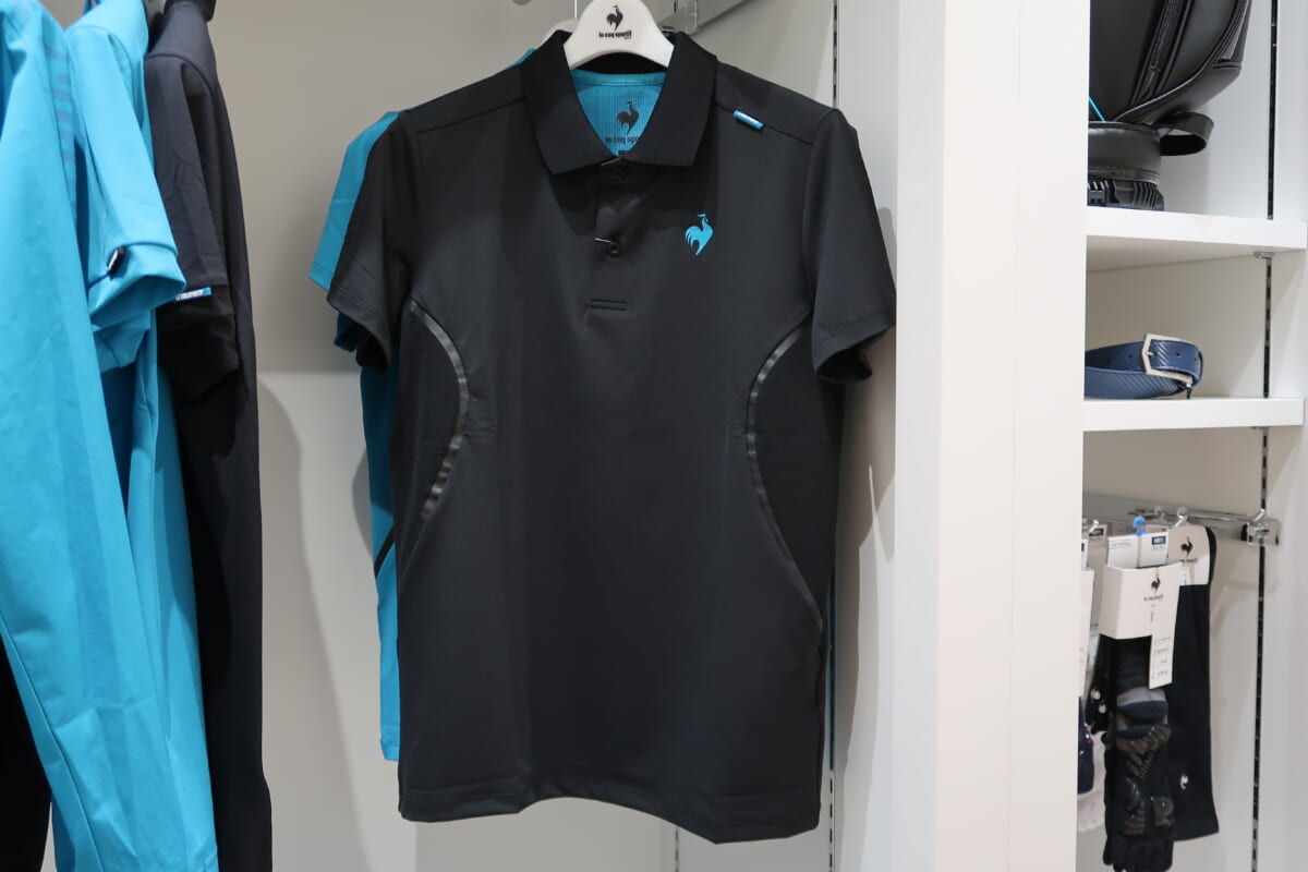 もうひとつが「ボディーシェル半袖ポロシャツ」。こちらは、両脇にメッシュ状の同色異素材を曲線で配置しています。吸汗速乾性能に優れたストレッチ素材と、メッシュによる熱の発散で真夏のラウンドを快適にします。こちらもロゴだけ異色を使うことでワンポイントとして際立たせています。再生ポリエステルを使用し環境に配慮した一枚。価格は1万3200円。