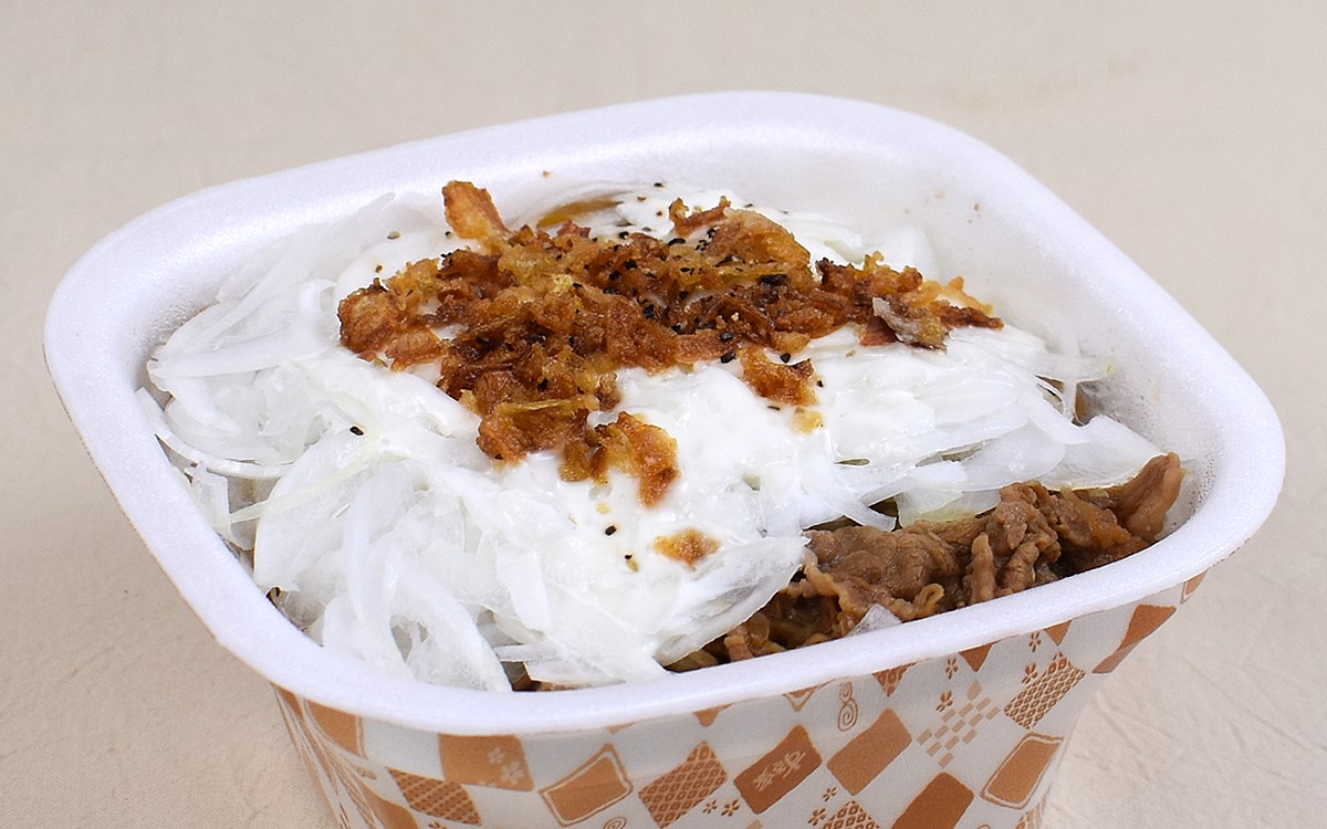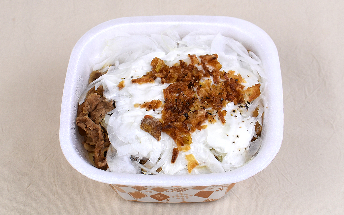 通常の牛丼にみずみずしい国産新玉ねぎのスライスが乗った「クリーミーオニサラ牛丼」。味つけには玉ねぎが香るクリーミーソースを用い、まろやかな甘みの一品に仕上がっています。さらにカリっと香ばしく揚げられたフライドオニオンをトッピングに使用。1つの商品の中で、色々な形の玉ねぎを堪能できますよ。