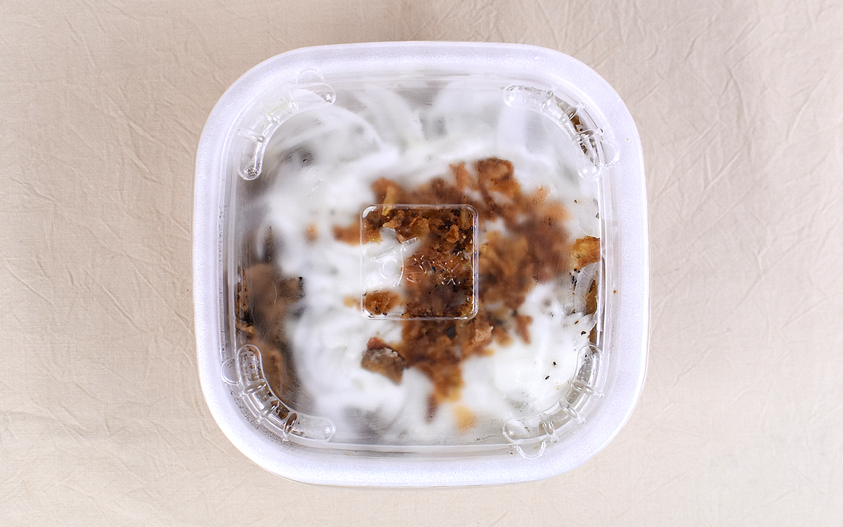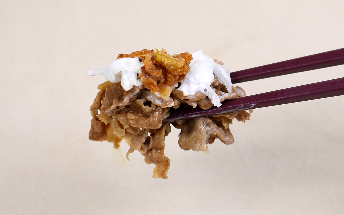 フタを開けると細長くカットされたオニオンスライスがどっさり。ご飯一面を覆うほど大量に乗っており、具だけでも中々ボリューム満点です。さっそく一口食べてみたところ、オニオンスライスはシャキっと爽快な歯ごたえ。噛んだ瞬間に玉ねぎの優しい甘みが口の中を満たしてくれました。