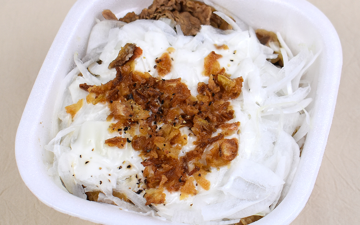 全体にかかるクリーミーソースは、ほんのりと酸味があって抜群の食べやすさ。想像よりもさっぱりした味わいで、牛丼全体にかかっていてもくどさがありません。玉ねぎはもちろん牛肉とも相性がよく、肉を軽い口当たりのソースが包み込んでどんどん箸が進みます。わざわざ別でサラダを頼まなくても、野菜とお肉を存分に摂取できるのは助かりますね。