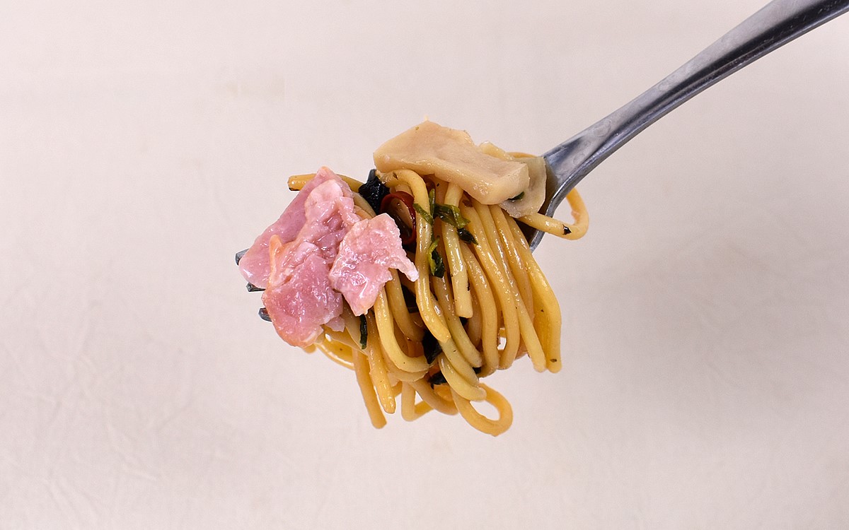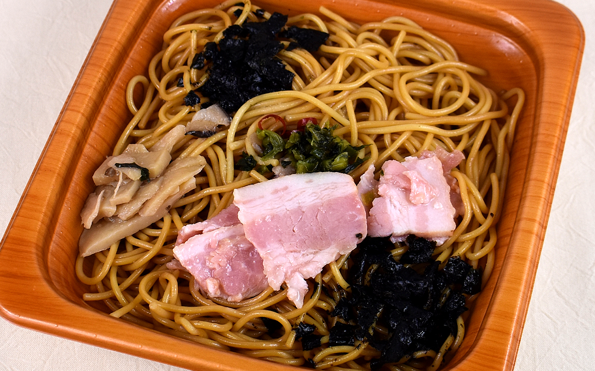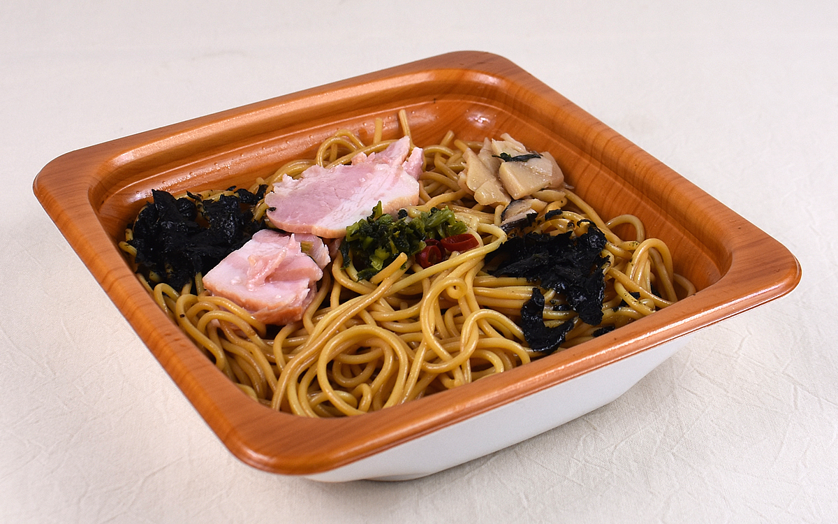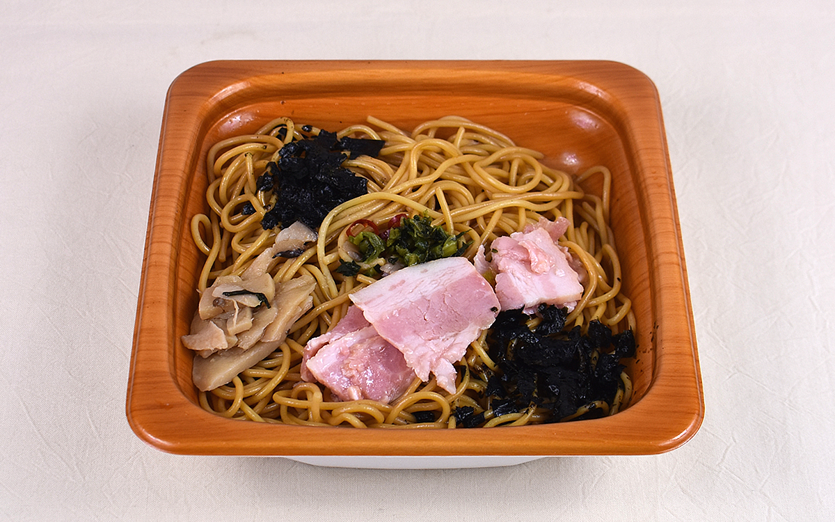 まず気になるのは味つけ。ファミマの公式サイトによれば、パスタは“だしつゆ”で炒めているそう。具材はベーコンと醤油と合わせたエリンギの他に、高菜漬け、刻み海苔、唐辛子をトッピング。だしつゆ×醤油が染みこんだ和テイストを期待できる一品です。