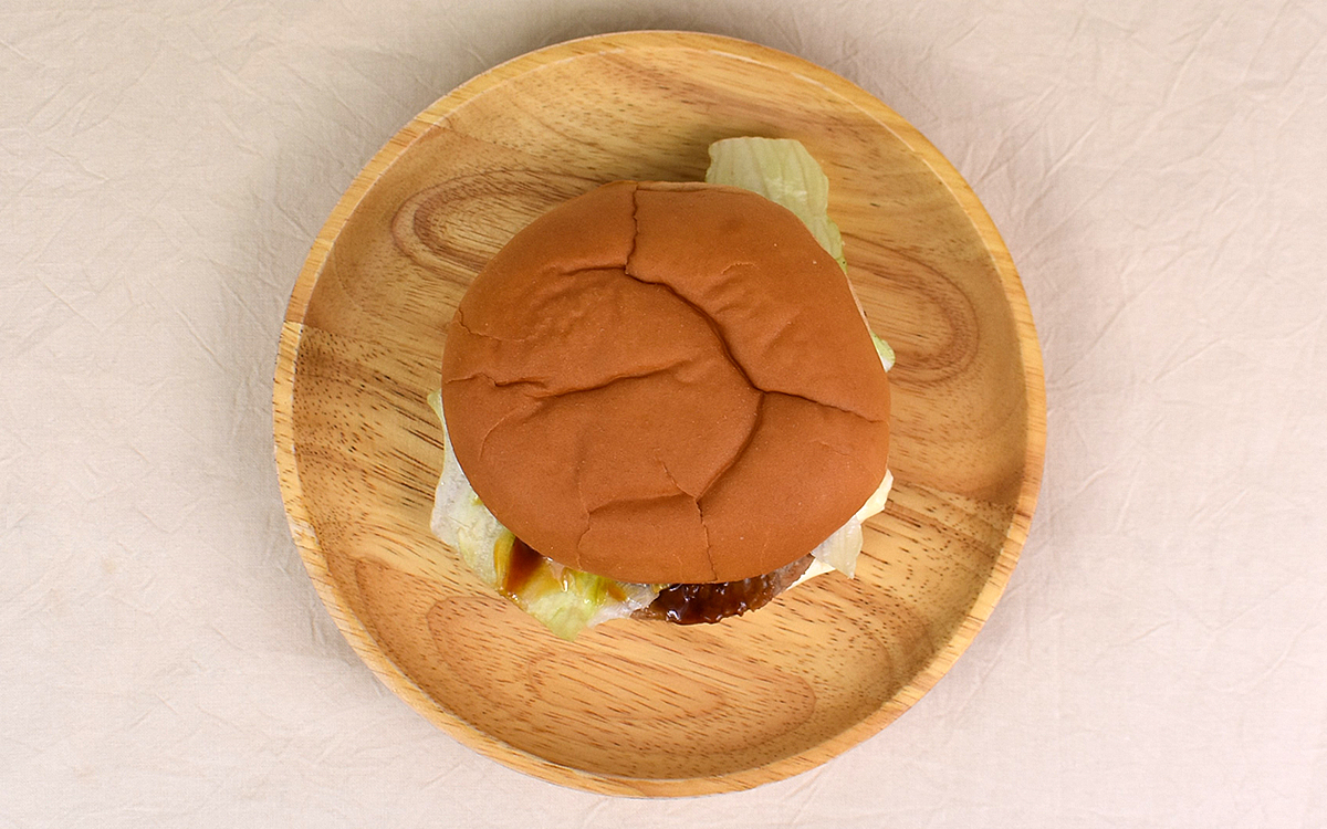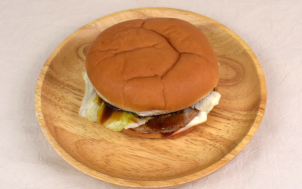 袋を開けてみると、ソースの少しツンとした香りがふわり。柔らかなバンズの間には、ソースがたっぷり染みたハンバーグパティやレタスなど定番具材が挟まっていました。どの具材もバンズからはみ出るほどの大きさで、ボリュームばっちり。サイドメニューをつけずに単品で頼んでもしっかりお腹を満たしてくれるサイズ感です。