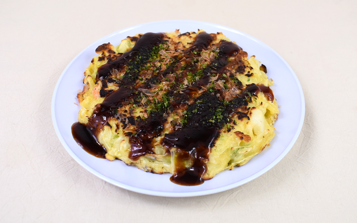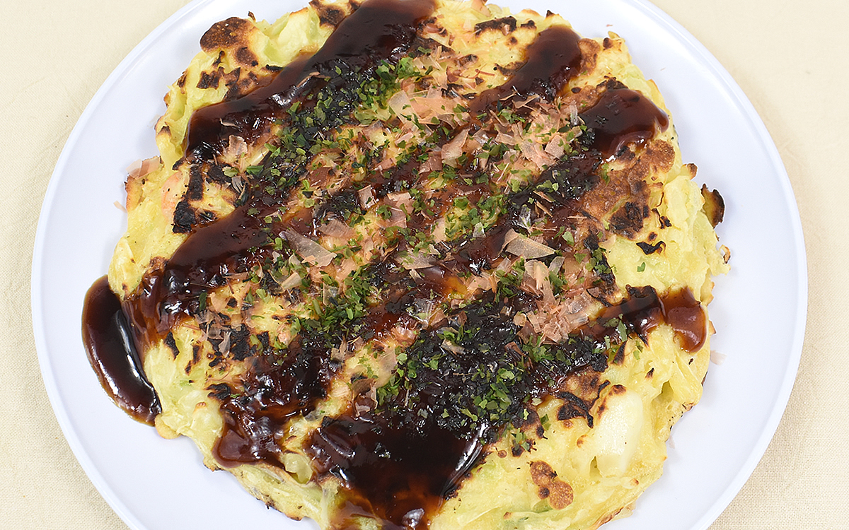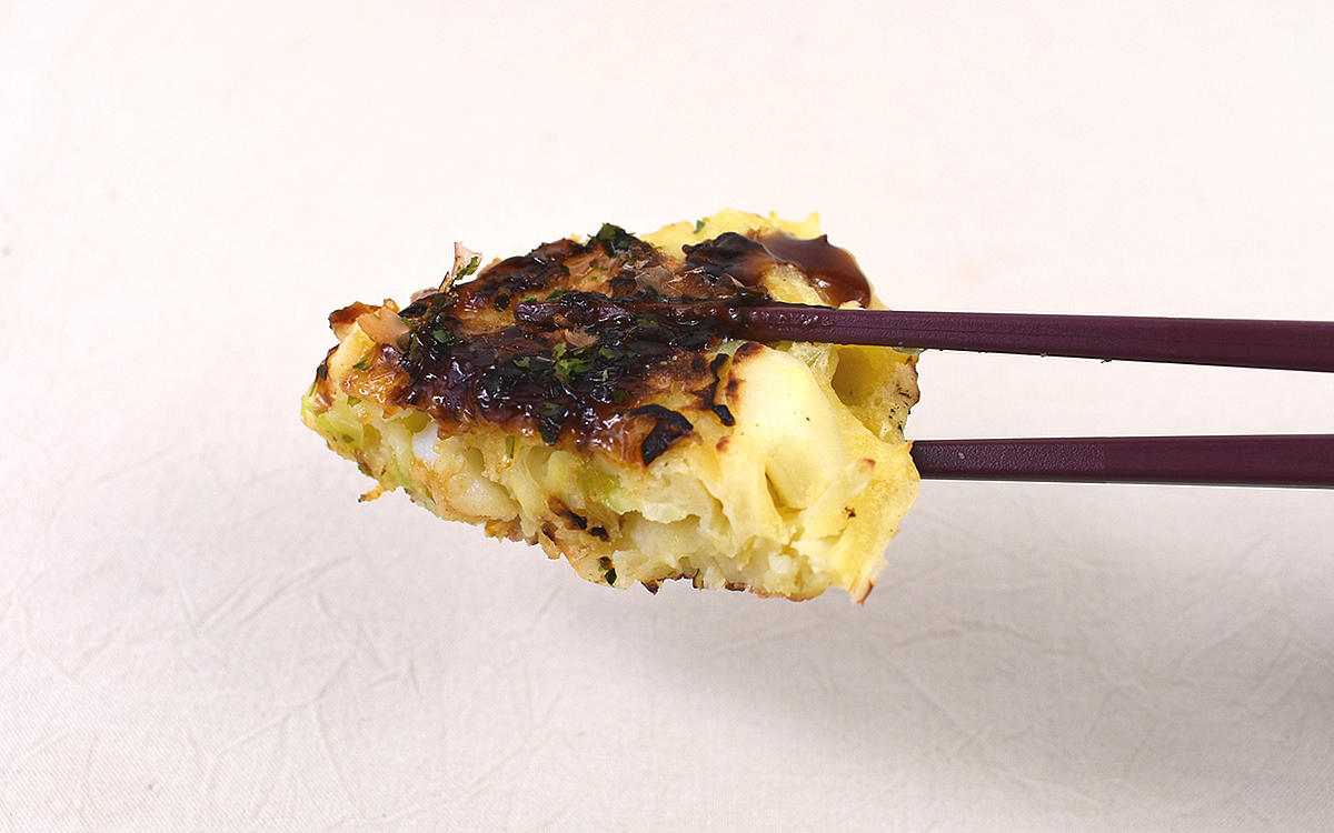 さらに驚かされたのが、お好み焼きの具材としてしっかり馴染んだイカとエビの味わい。海鮮素材はどうしても味の主張が強いというイメージを抱いてしまいますが、生地から感じる塩味ともバランスはばっちり。ソースやかつお節との相性もよく、“THE 王道”とも言えるお好み焼きの味わいに絡むイカとエビの旨味がたまりません。