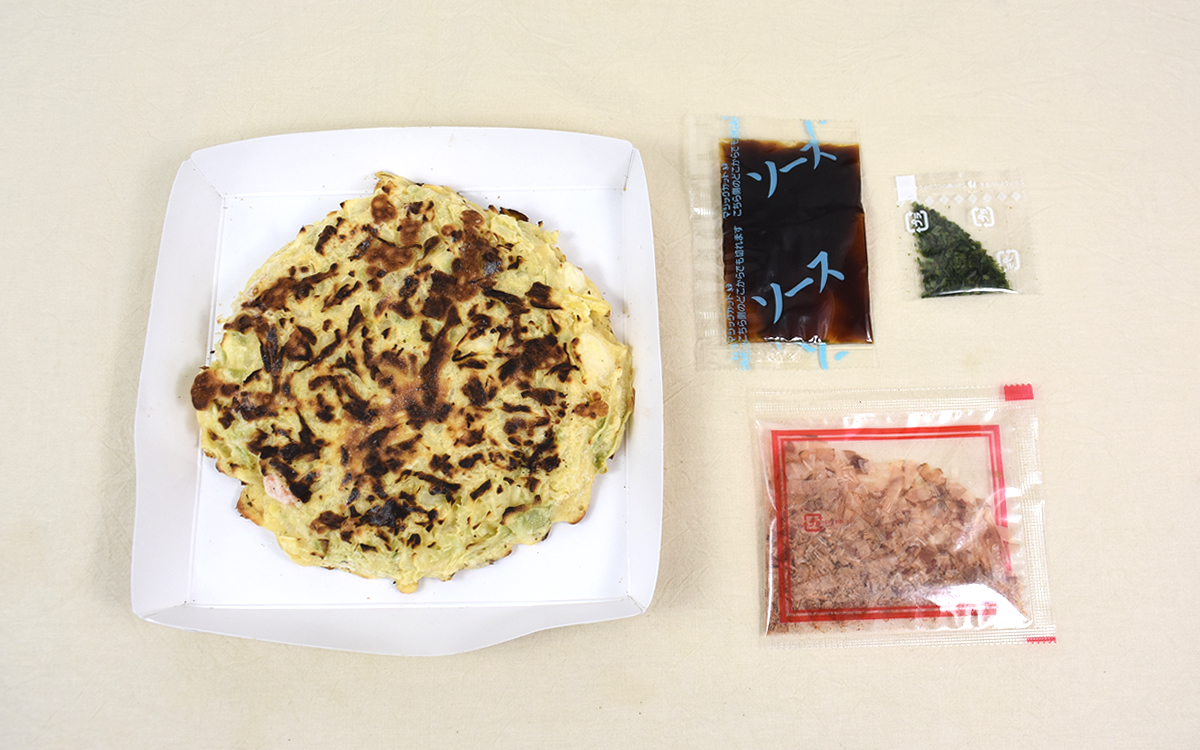 お好み焼きの具材といえばキャベツや豚肉がメジャー。同商品は“海鮮”ということもあり、国産キャベツの他にイカとエビをトッピングしているのが特徴です。ちなみに電子レンジ調理専用のパッケージで、調理時間の目安は500Wで約7分10秒(600Wの場合は約6分40秒)。じっくり加熱されたお好み焼きがどれほどの食感をもたらしてくれるのか、湯気の立つ様子を見て期待が高まります。パッケージにはソース・かつお節・あおさが添付されているので、まずは生地の表面にそれぞれたっぷり重ねていきましょう。