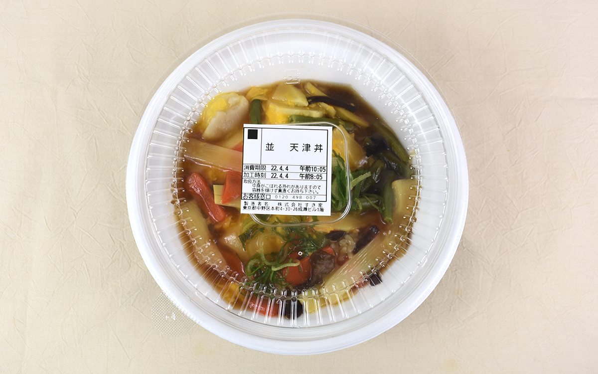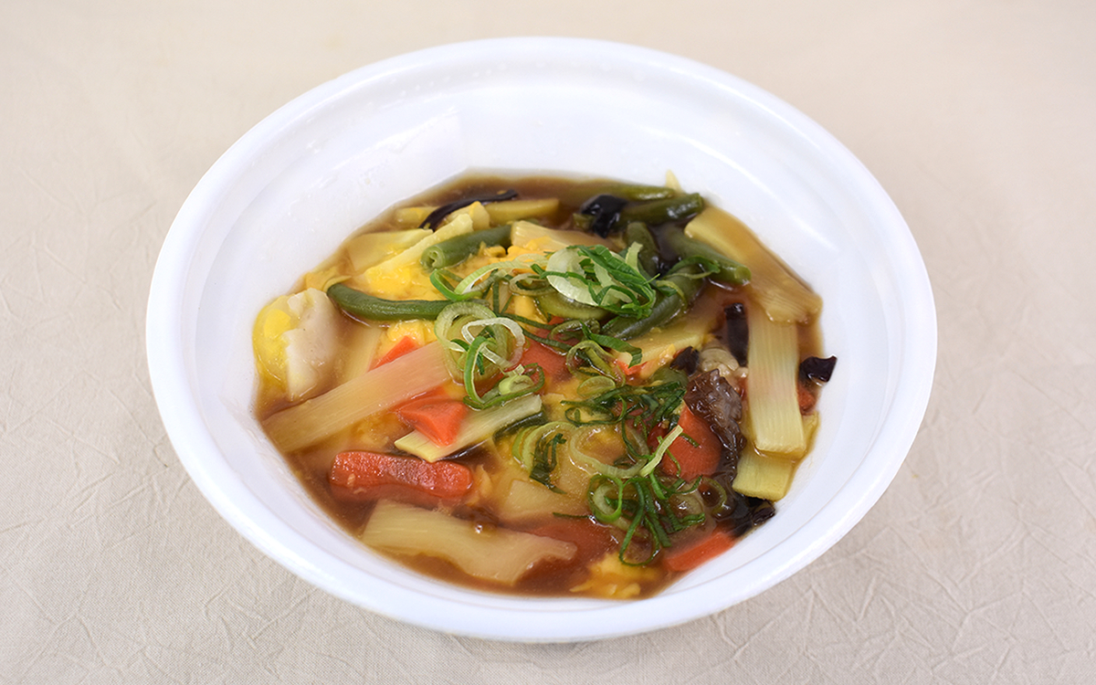たまごと複数の野菜などを乗せ、甘酢あんで仕上げた「天津丼」。野菜はたけのこをはじめ、インゲン・にんじん・ミズクワイをメインに使用しています。さらにコリっと美味しいきくらげもトッピング。器いっぱいに具材が盛られているため、一食だけでもしっかり空腹を満たせるボリュームですよ。