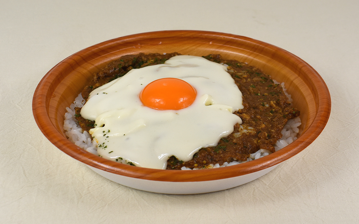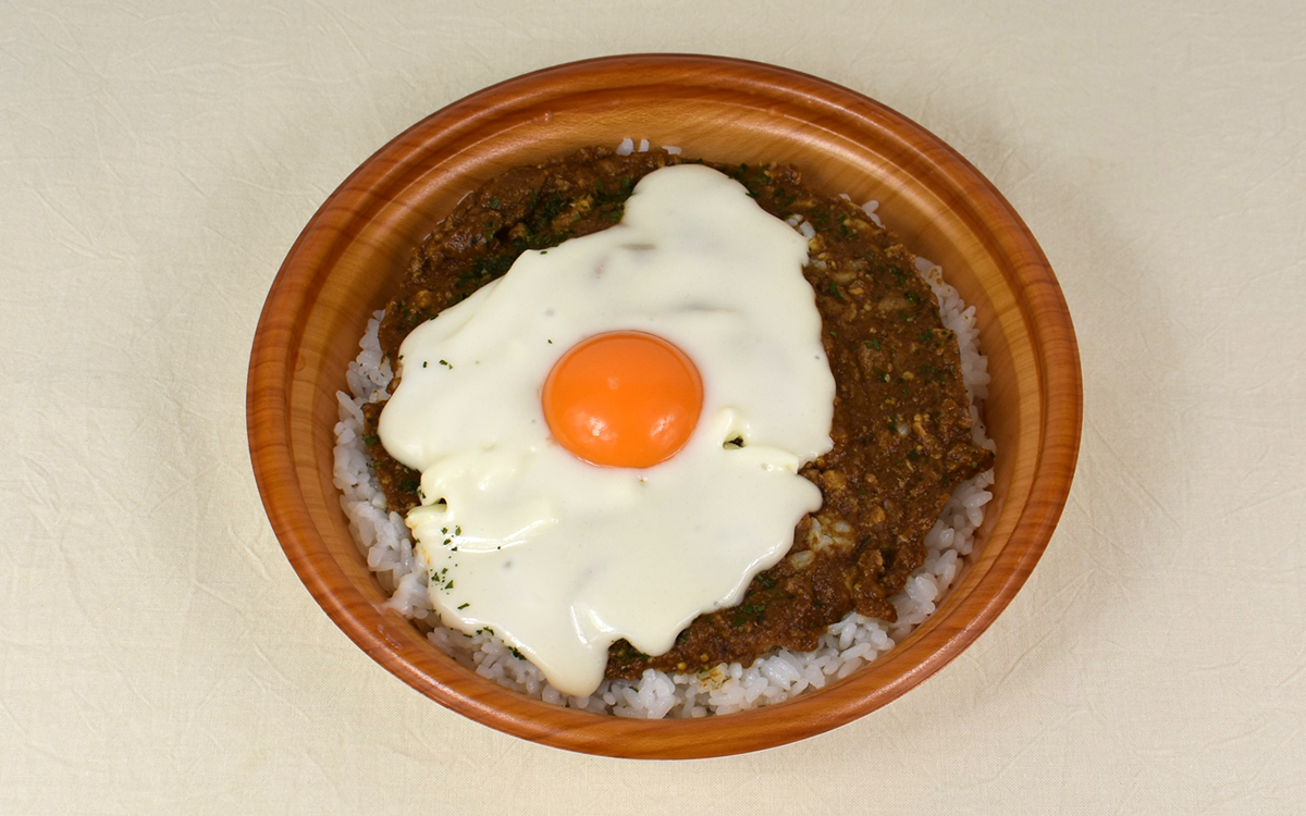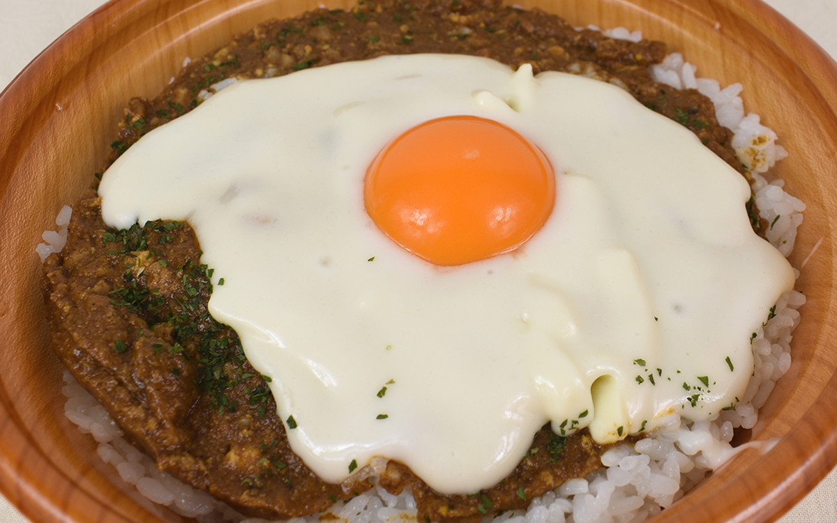 まず注目したいのは、目を引くホワイトソース×黄身。ソースにはモッツァレラチーズが入っているため、温めると“とろーり”としたルーに変化します。さらに卵黄が加わることで、よりまろやかな味に。スパイシーなルーと絡めた時の相性も気になりますね。