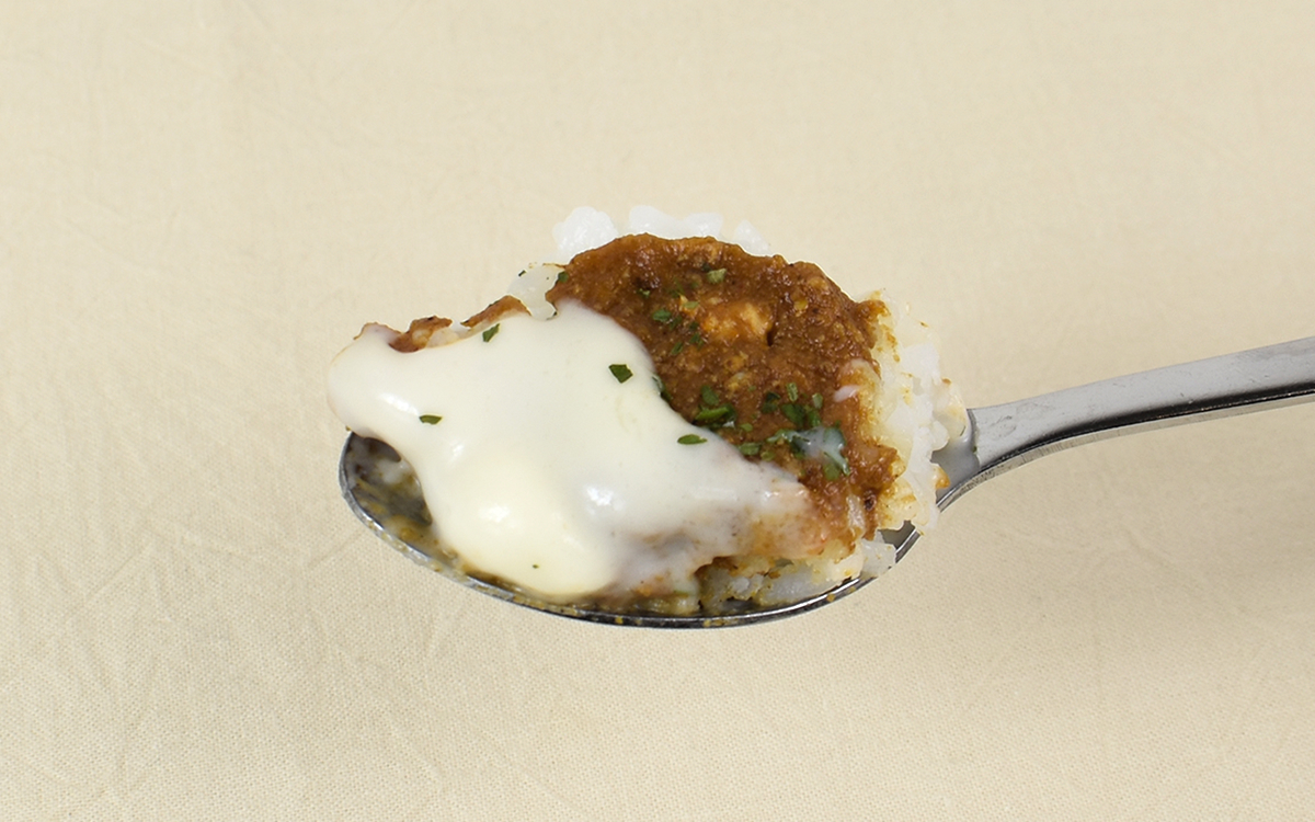 実際にルーをすくってみたところ、チーズインソースは縦に伸びるほどトロトロ。最初に超まろやかなテイストが広がり、後からルーの程よい辛味がプラスされました。また、チキンのジューシーな後味が旨味をアップさせている印象です。