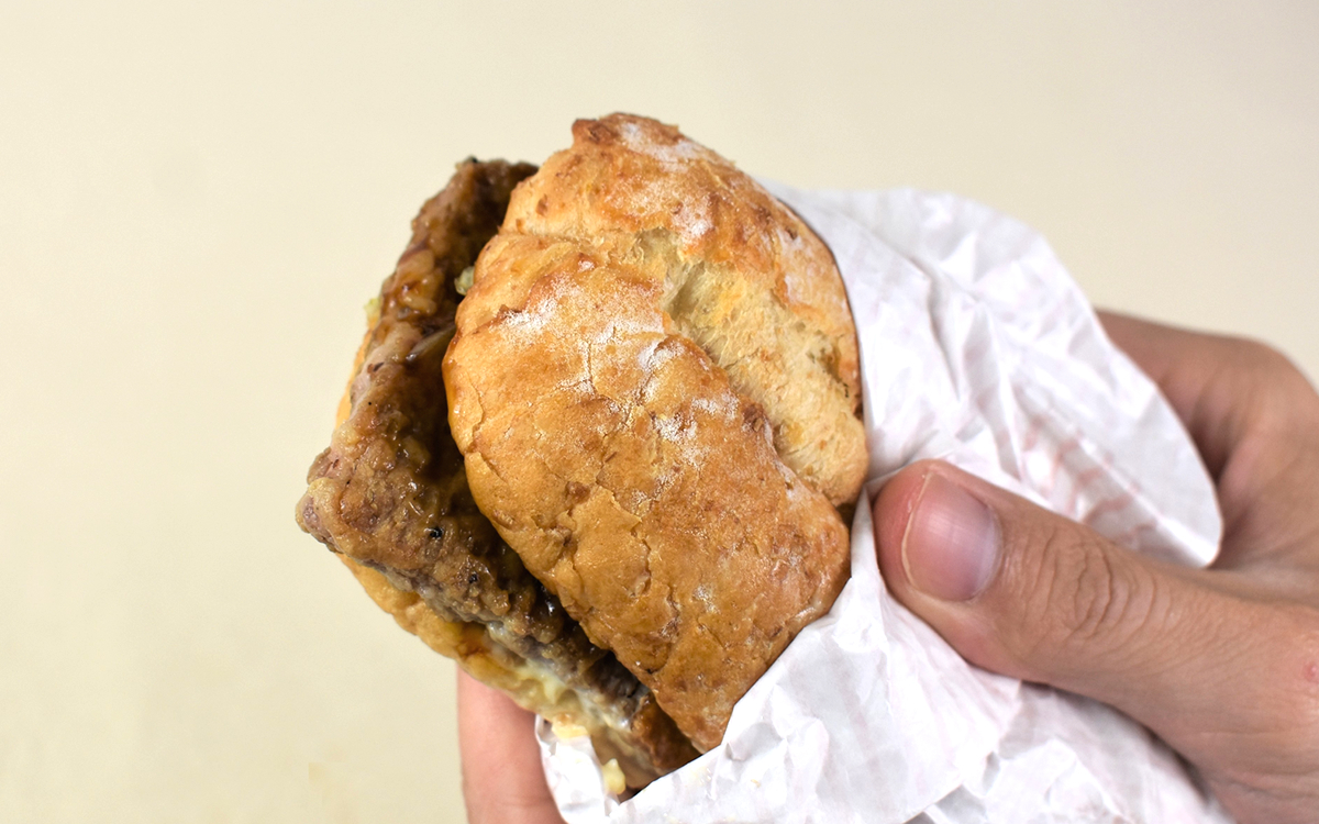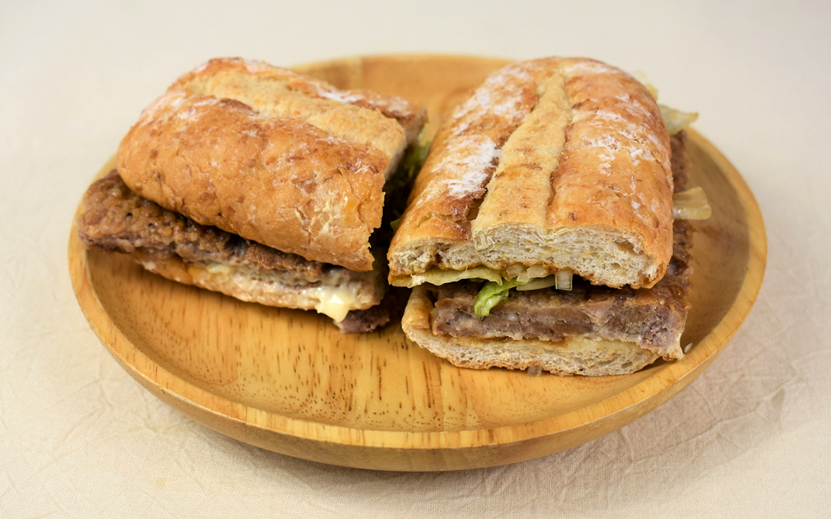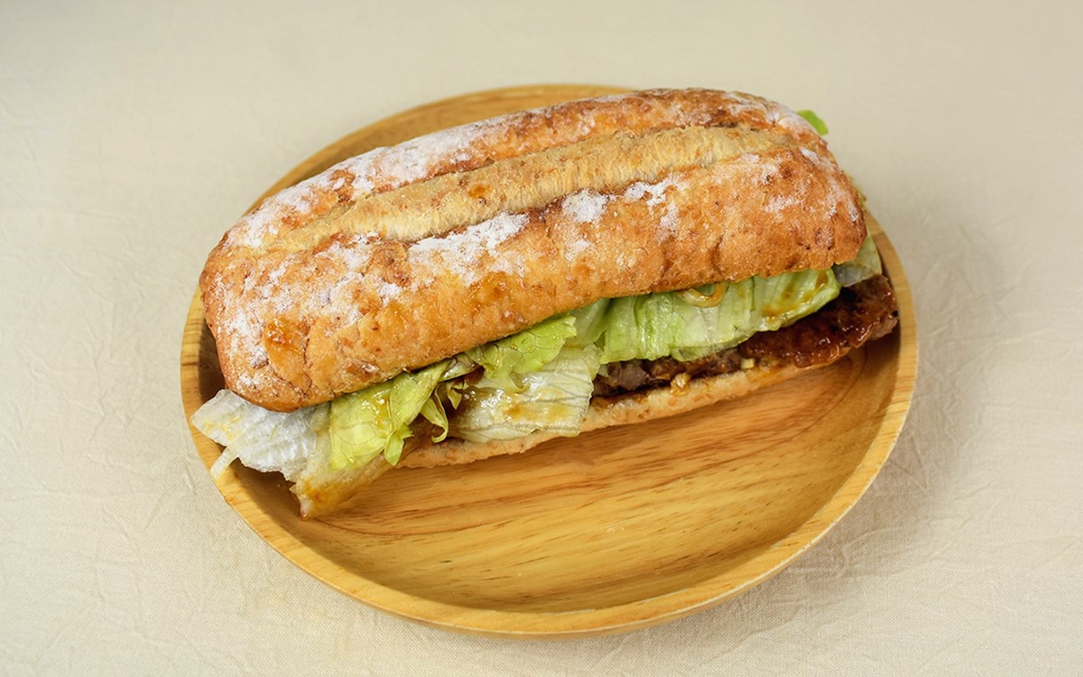 ポークパティに加えて、スライスオニオン・レタス・マヨソースを入れた同商品。どの具材もはみ出るほど挟まれており、食べごたえ抜群の一品です。サンドには全粒粉の入ったソフトフランスパンを使用。具はもちろん、パンもおいしいサンドに仕上がっていますよ。