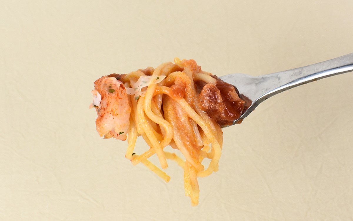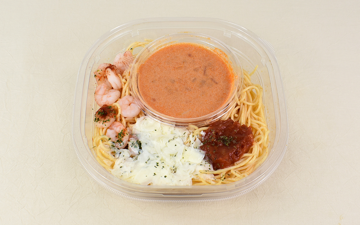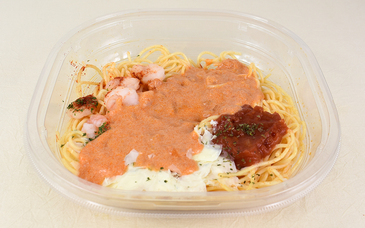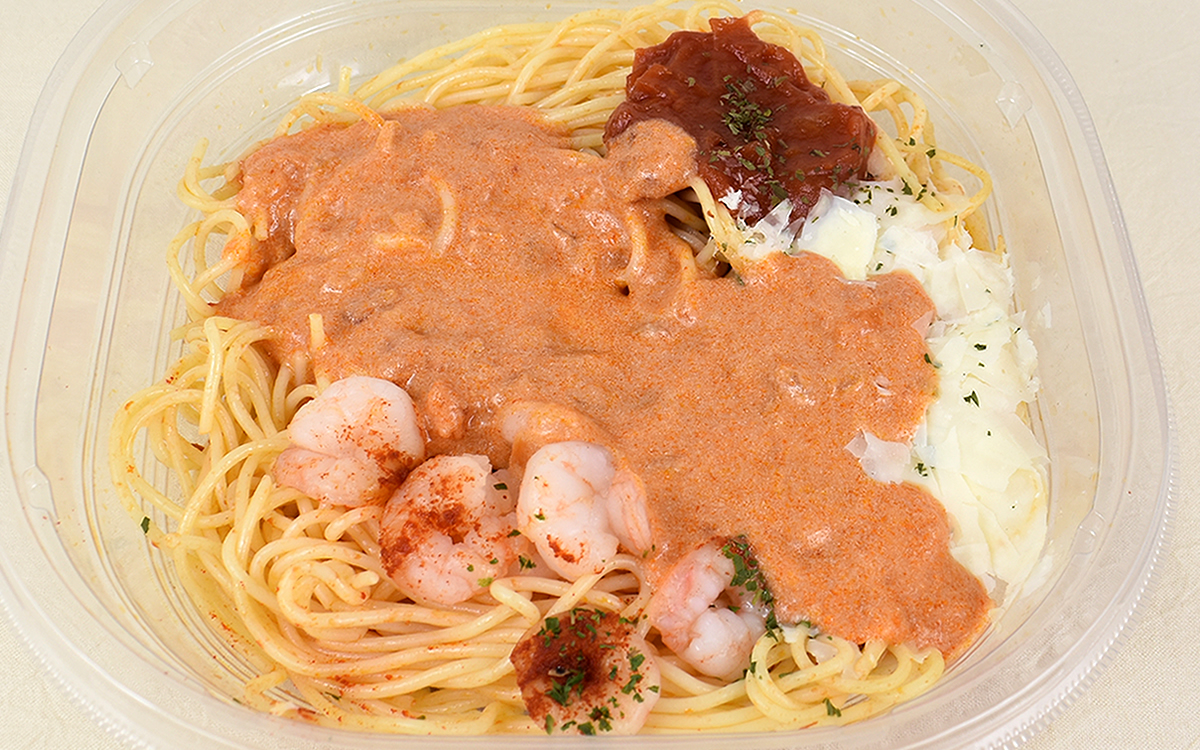 トマトクリームソースをたっぷり詰めこんだパックが目を引く同商品。具材として小振りの海老・粗くつぶしたトマト・薄削りのパルメザンチーズがトッピングされていて、紅白のカラフルなビジュアルでいただく前から目を楽しませてくれます。