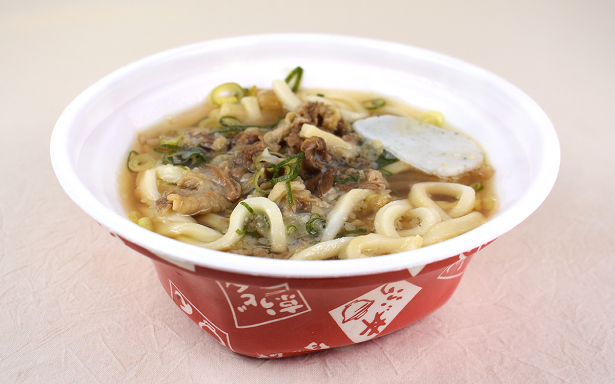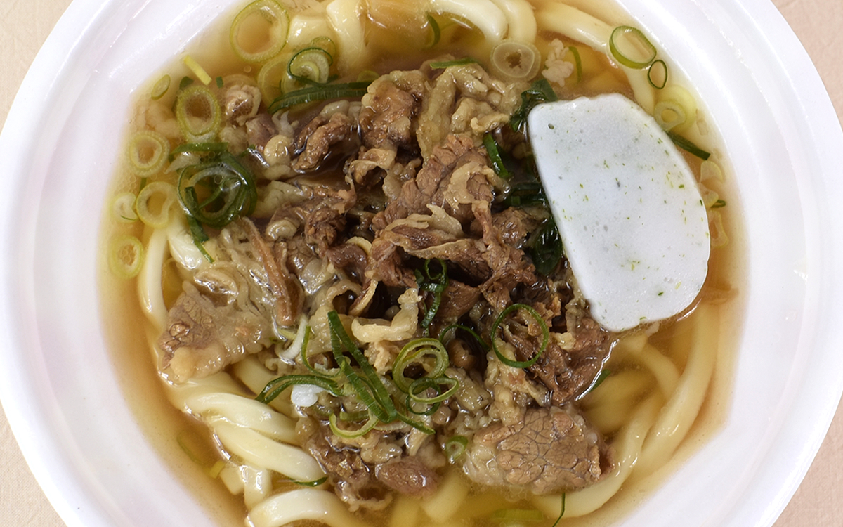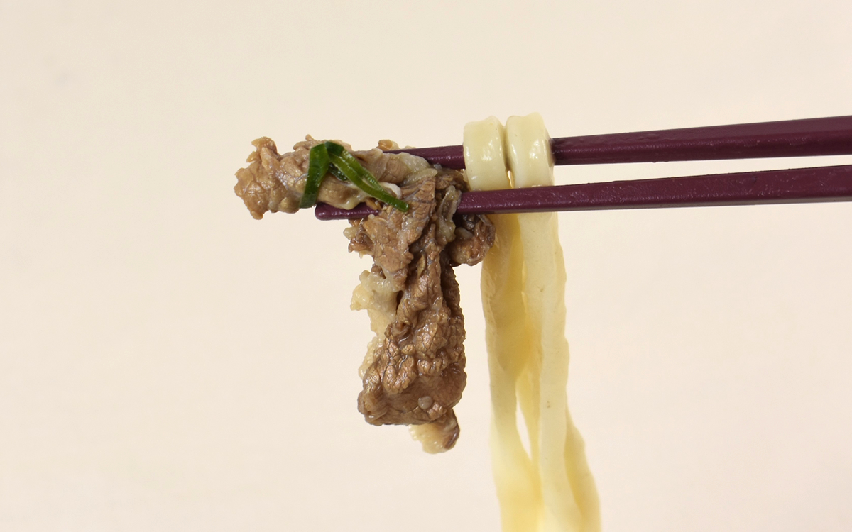 さっそく「牛肉うどん」を食べてみると、牛肉は薄めのカットながらしっかりとした噛みごたえ。麺つゆの染みこんだ肉は絶品で、噛むとほのかな甘みの汁が口内に広がります。