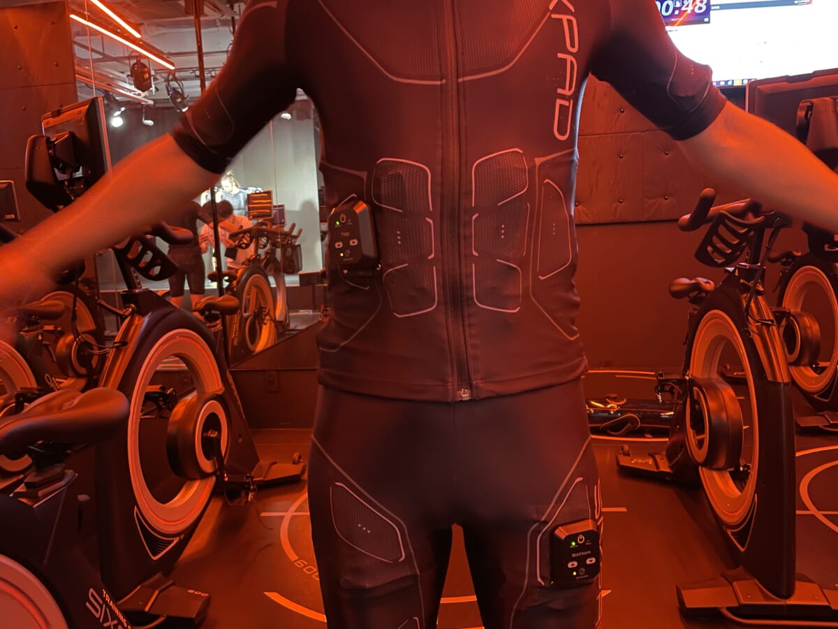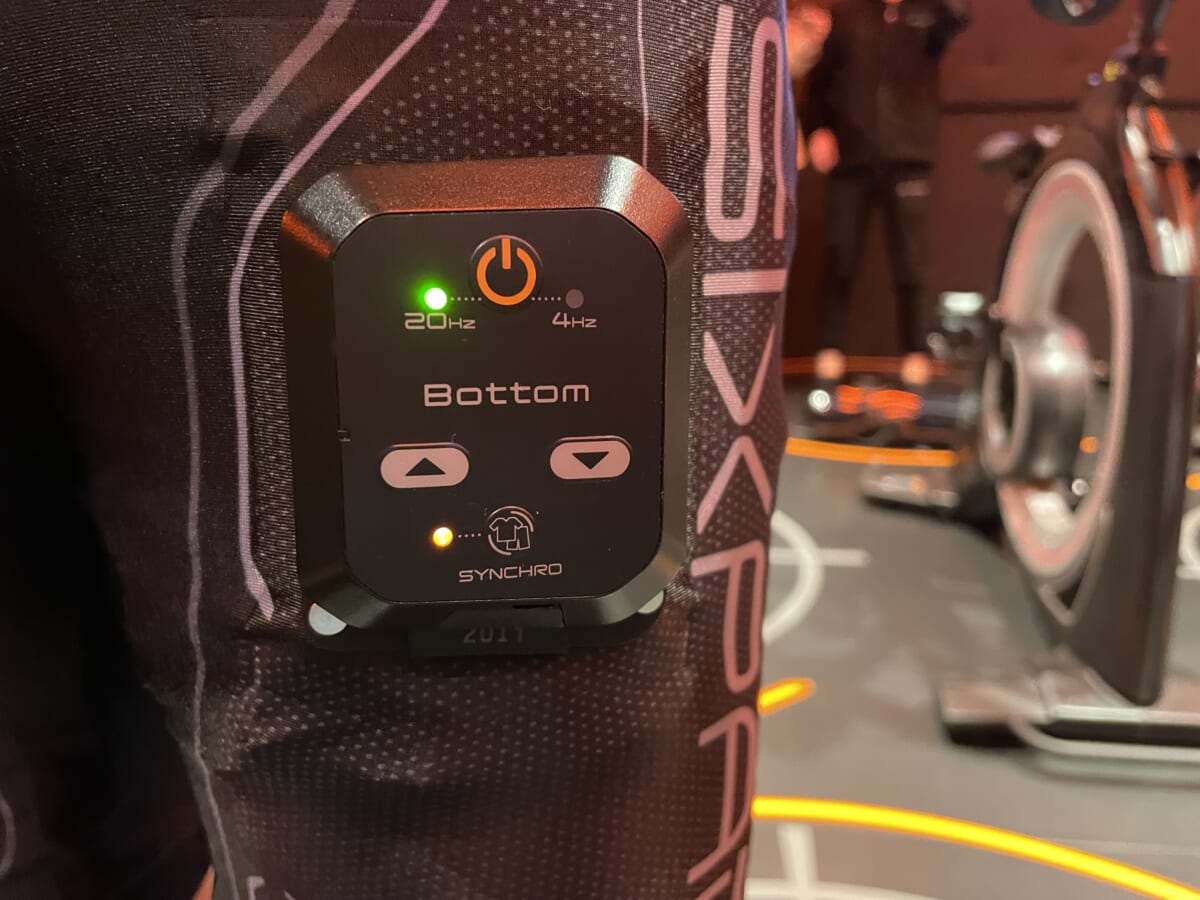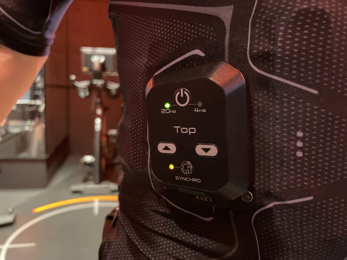着替えが終わるとスタッフの方がトレーニング体験ルームに案内してくれました。そこでEMSの電気刺激を流す専用コントローラーをセット。ボタンを入れると、EMSがウォームアップ、運動、クールダウン……と変わっていきます。