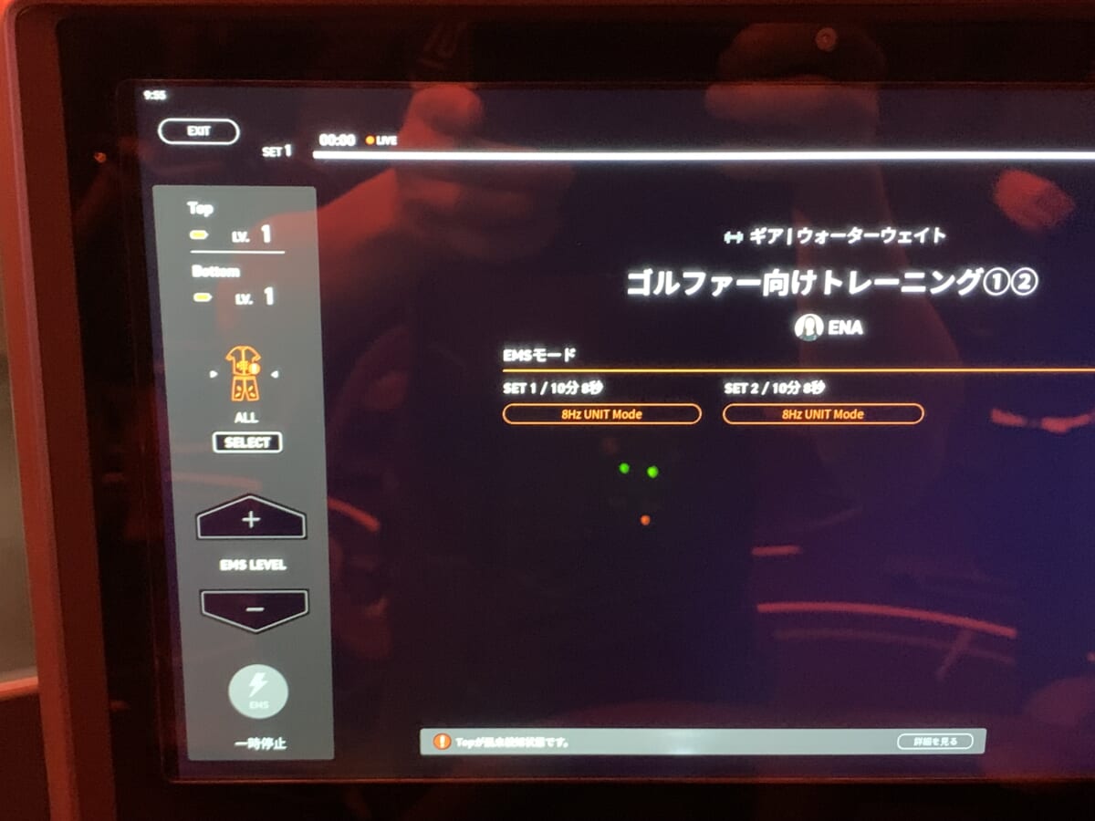 電気刺激の強弱はモニターで操作します。若い女性スタッフが「私はいつもレベル8でトレーニングしています」とのことでしたから、40代後半のおじさんはレベル5でスタートしようとしたら、レベル10まで勝手に上げられてしまいました。男性はそのくらいの刺激を入れてトレーニングしてくださいということなのでしょう。