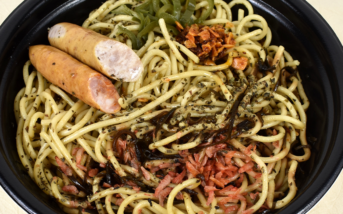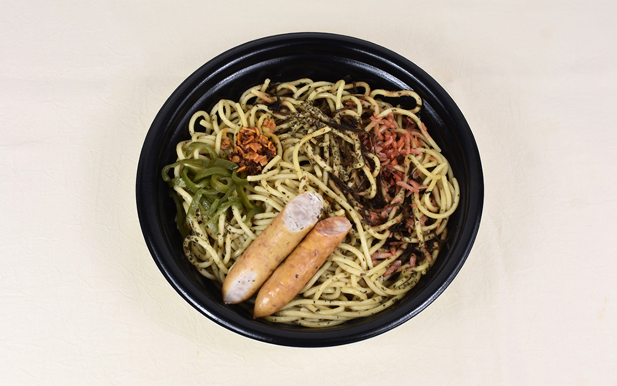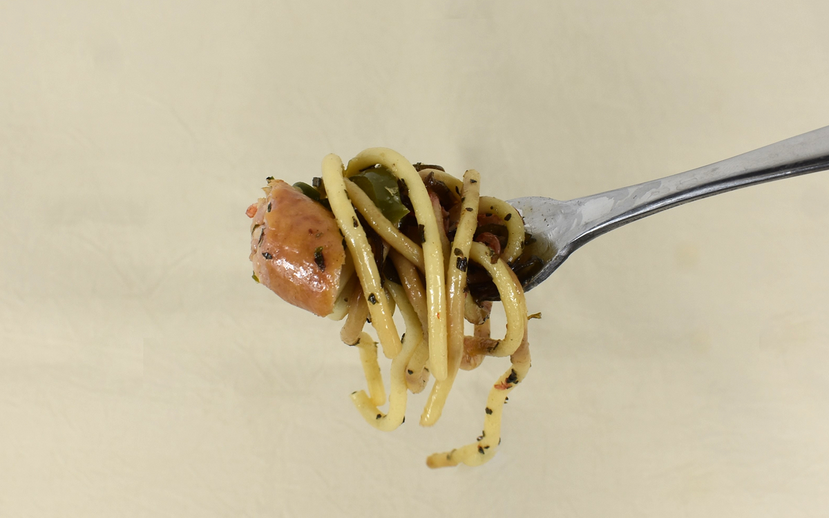 パッケージを手にして真っ先に驚いたのは豊富な具材。立派なウインナーもさることながら、ピーマン・塩こんぶ・小えびの組み合わせに目が引き寄せられます。電子レンジで加熱(目安時間/500Wで4分)してフタを開けると、さっそくバジルと小えびの香りがふわり。フォークで口に運んだ麺は太く歯ごたえがあり、噛むごとに伝わってくるモチモチ食感がたまりません。