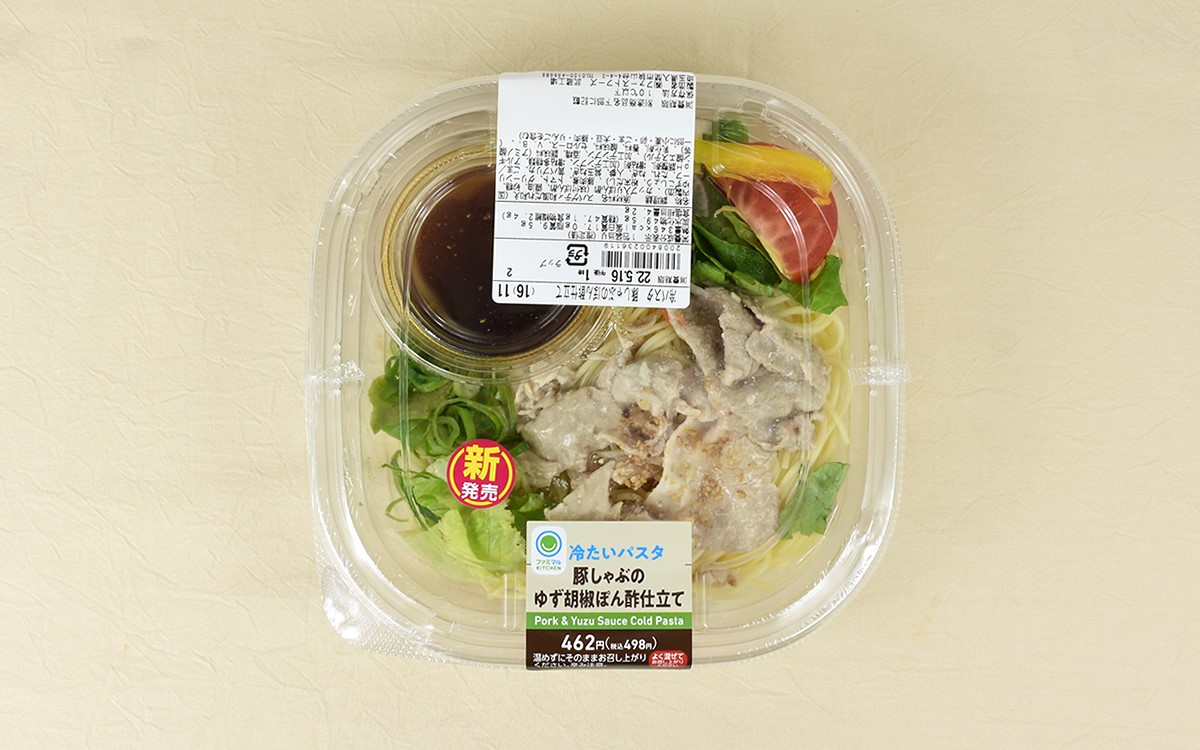 気温の高い日が増えてくると、ランチもあっさりしたものを選びたくなりますよね。そこでオススメなのが、5月10日よりファミリーマートに新登場した「冷たいパスタ 豚しゃぶのゆず胡椒ぽん酢仕立て」(498円/税込)です。ゆず胡椒を味つけに使ったひんやりパスタの味わいを、さっそくチェックしていきましょう。