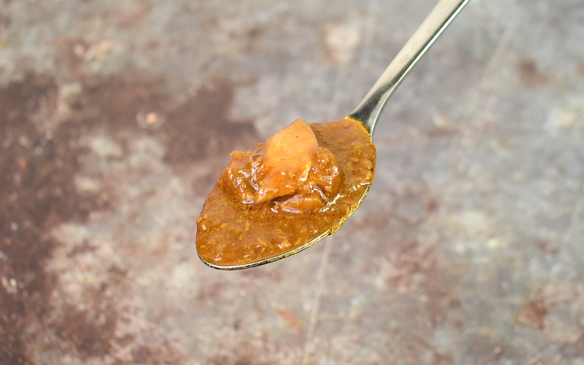 ひと口食べてみると、ルーは思ったよりも口当たりが滑らか。意外にもルーの中に細かくカットされた生姜が入っており、噛むたびにシャキシャキという食感が。コリアンダーやターメリックなどのスパイシーな味わいと生姜のフレッシュな酸味が相性バツグンな上に、やみつきになる辛さを演出してくれました。