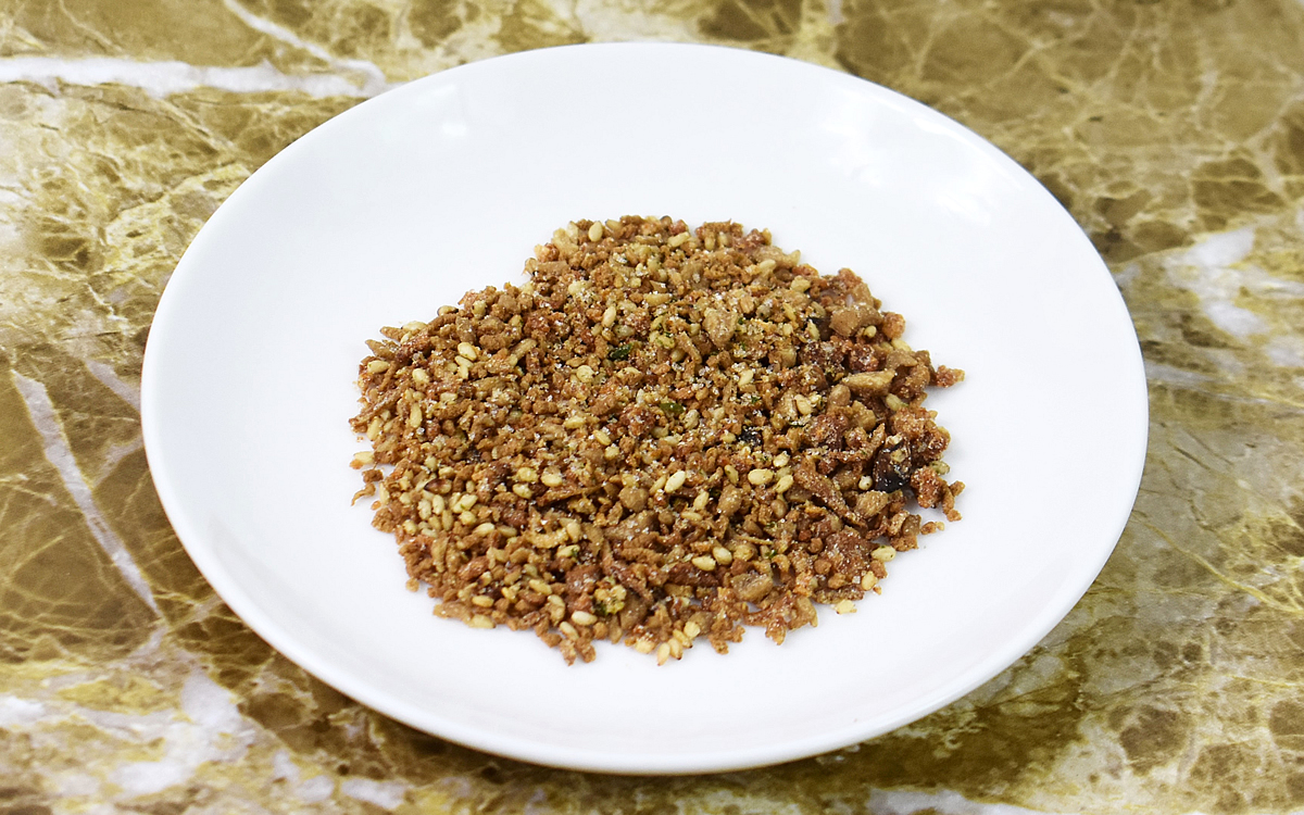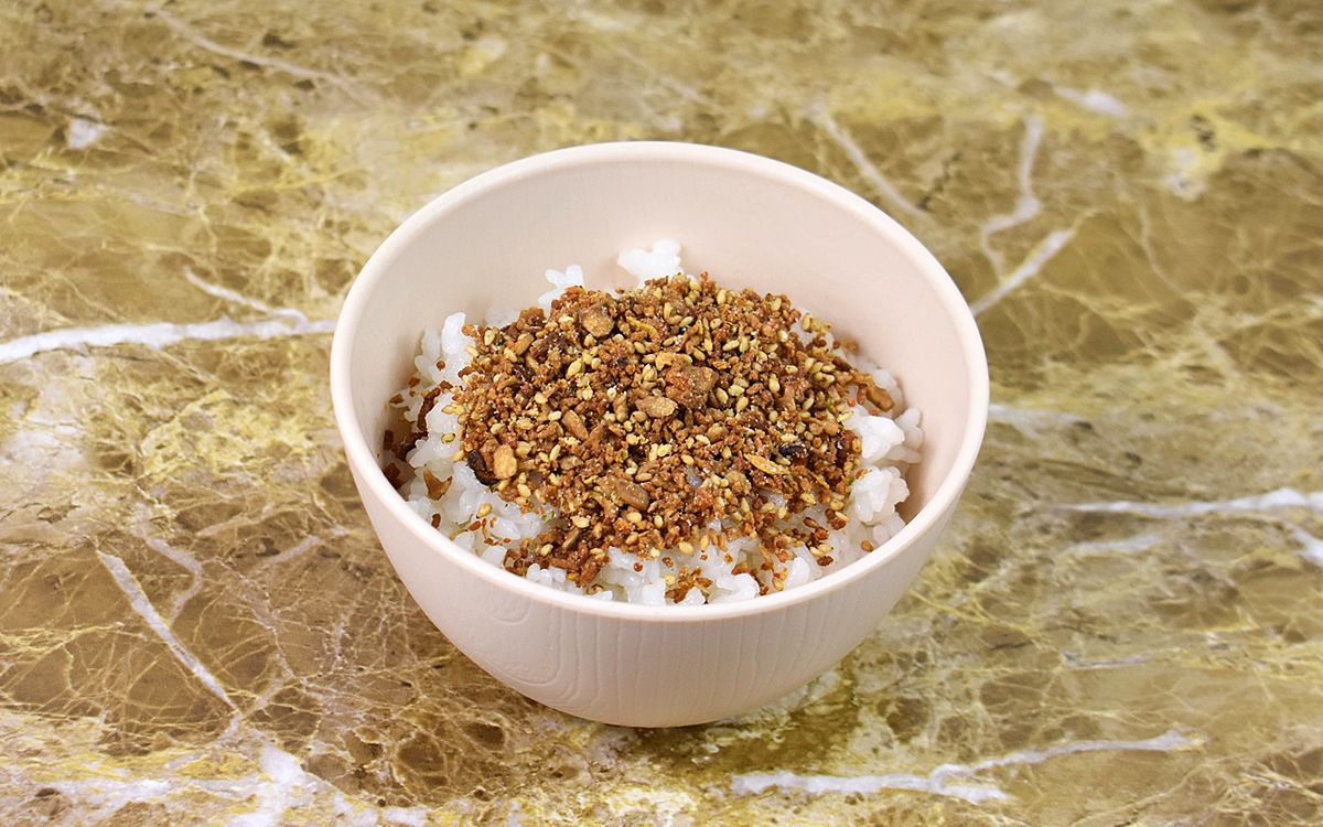 さっそく出来立ての白飯に同商品をふりかけると、湯気と共に中華ならではと言えるこうばしい香りが。ふりかけの1粒1粒は思ったよりも大きめのサイズで、焼き豚に似た色合いのチップと粒上のゴマが入っています。
