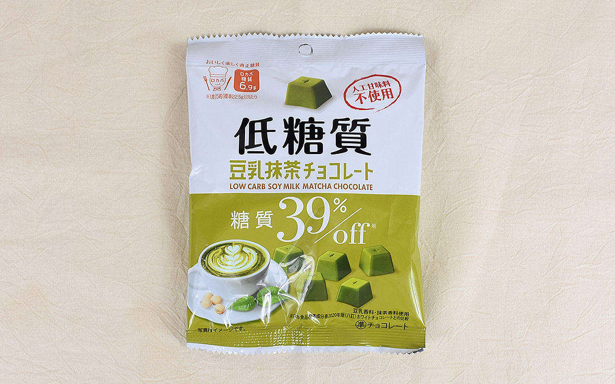 内容量が約36gの食べきりサイズである“低糖質豆乳抹茶チョコ”。コンパクトな見た目ですが、糖質39%オフ・人工甘味料不使用というポイントがあります。健康メリットが2つもあるので、スイーツを食べた後の罪悪感は気にしなくても大丈夫そう。