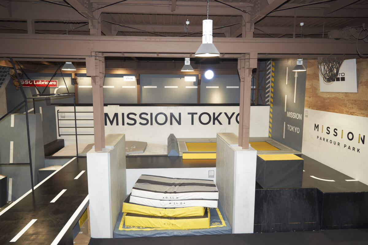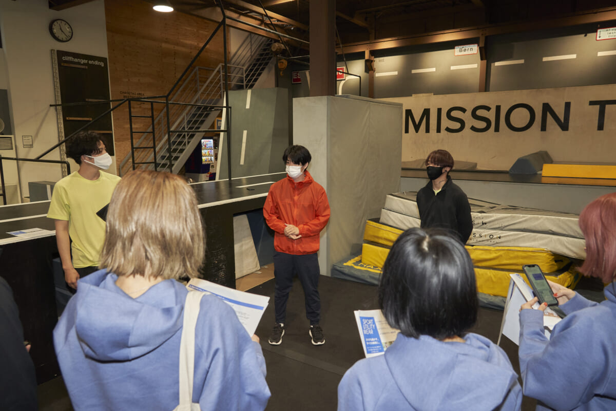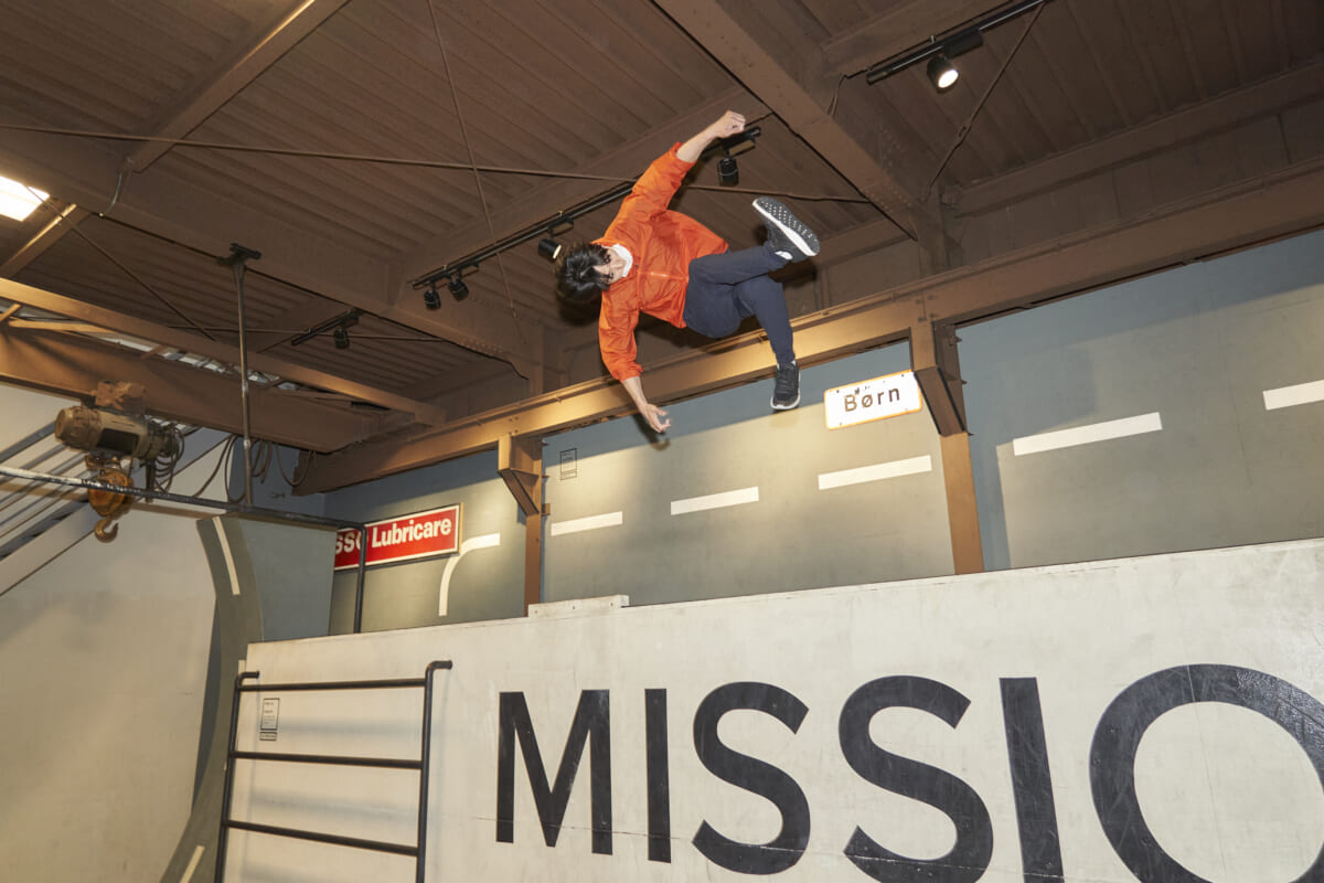 当日登場したのは、二人のパルクールプレーヤー。「MISSION PARKOUR PARK TOKYO」主宰のYUUTAROUさんと、TENさん。壁を駆け上がり、障害物を飛び越え、建物から建物へと跳び移る、身のこなしが軽いイケメンです。