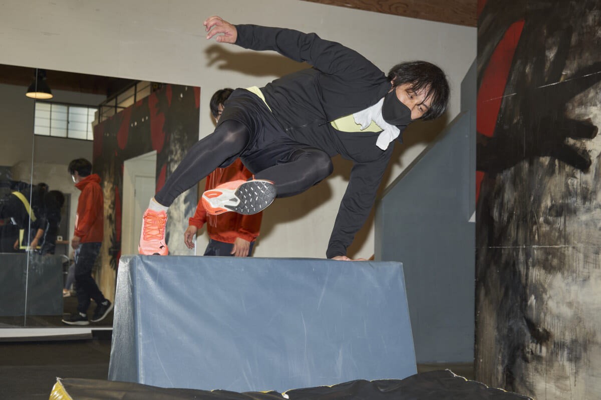 そして10分ほど平均台での片足立ちを練習したら、次は跳び箱のような障害物をヒラリと飛び越える訓練です。こういう動きのことをパルクールでは「ヴォルト」と呼ぶそうで、手すりやガードレールなどの腰くらいの大きさの障害物を越える時に使われる技。ヴォルトにもさまざまな種類があるんだとか。私たちが体験したのは初心者向けヴォルトでした。
