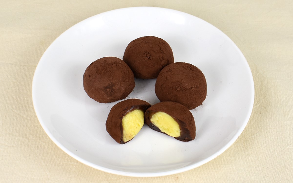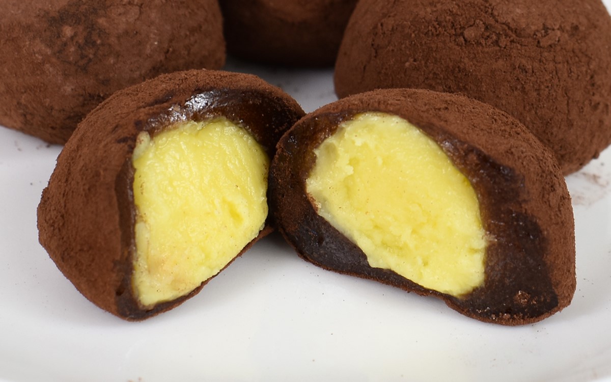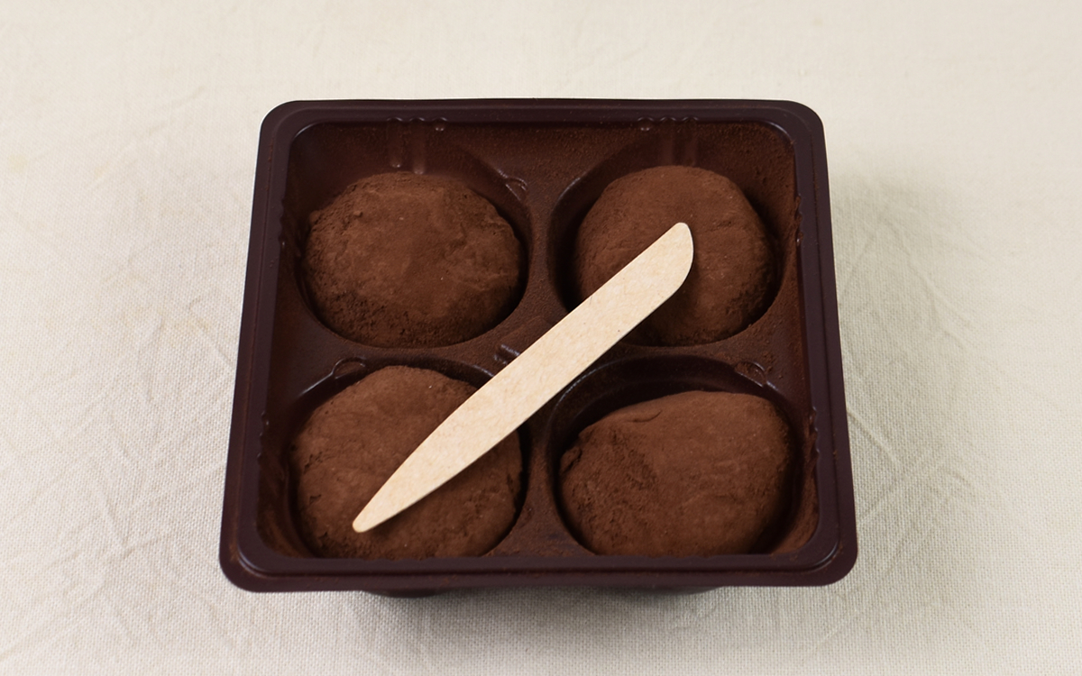 もっちりとしたお餅を使ったトリュフの中には、まろやかな甘みのバナナガナッシュをIN。さらに表面にココアをまぶしてほろ苦さをプラスし、絶妙な甘さバランスのチョコを楽しめます。