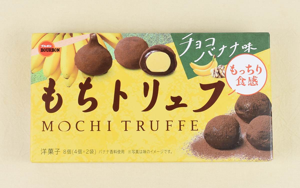 一口サイズの丸いトリュフが4個×2袋入った「ブルボン もちトリュフ チョコバナナ」。半分ずつ袋に小分けされているため、ちょっとした休憩時間のおやつにもぴったりです。個数も8個あるので、好きな人とシェアして食べるのもアリですよ。