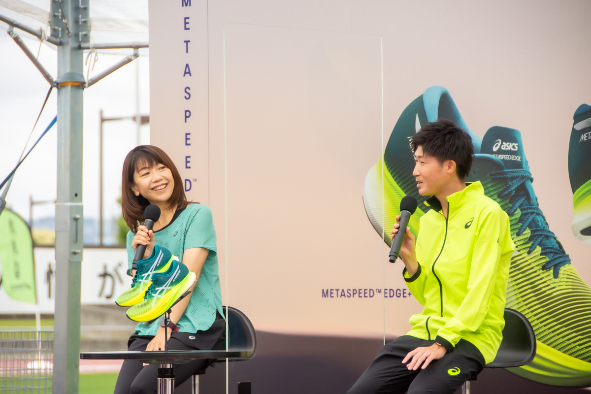 2000年シドニー五輪の金メダリスト、高橋尚子さんと2024年パリ五輪代表選考会「グランドチャンピオンシップ(MGC)」の出場権を第1号で獲得した細谷恭平選手(黒崎播磨)によるトークセッションでは新旧のトップアスリートが、それぞれのシューズへの思いを語りました。