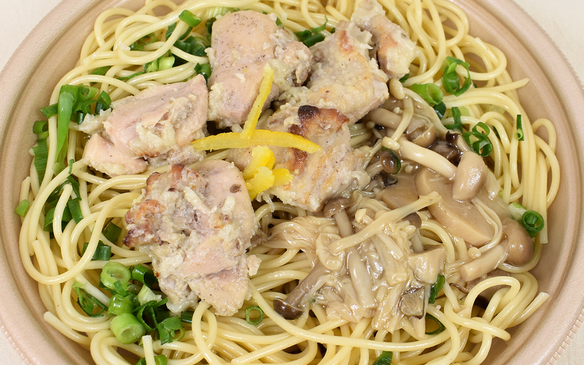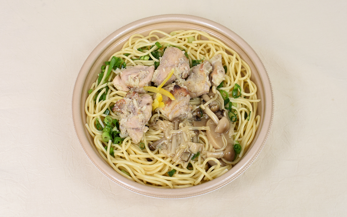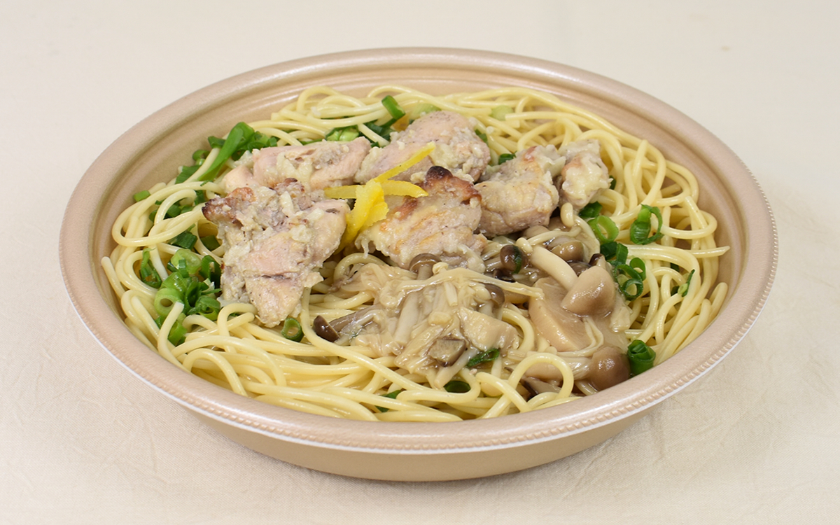 バター醤油味のパスタに柚子を加えたセブンの「鶏もも肉ときのこのバター醤油 柚子胡椒風味」。がっつりご飯を食べたい時は、ゴロゴロと大きなとりもも肉を堪能できる大ボリュームのパスタをぜひ買ってみてくださいね。