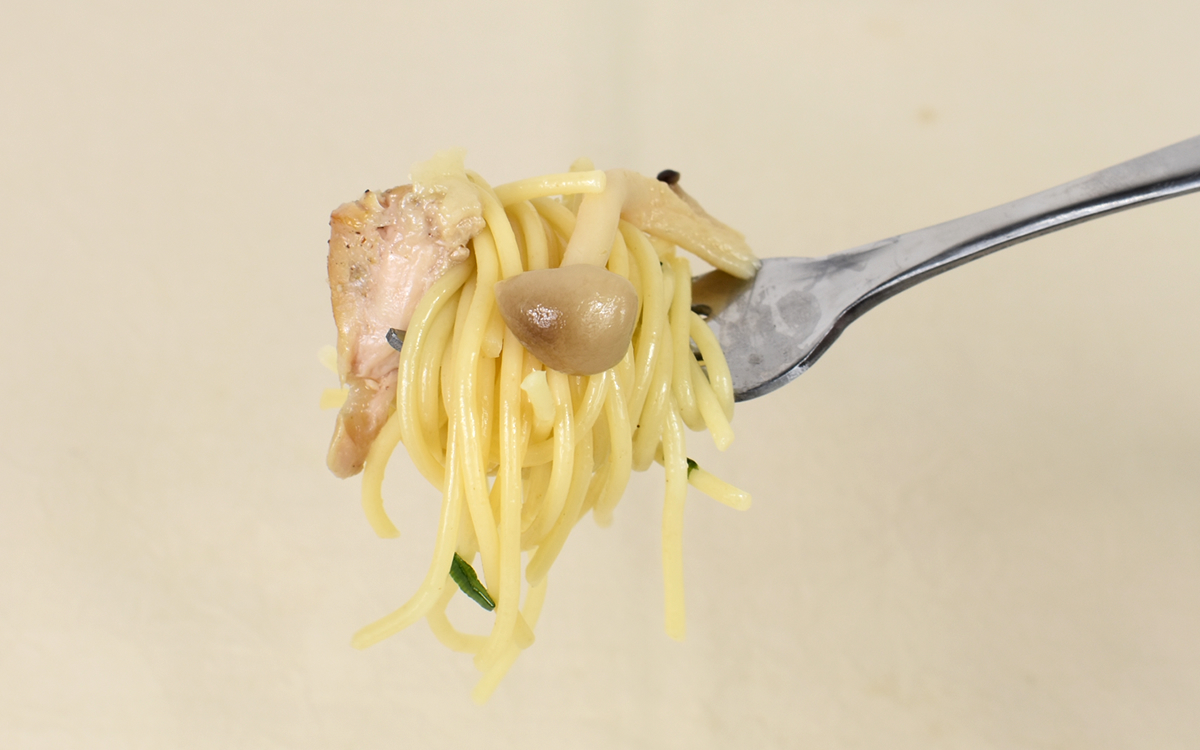 500Wの電子レンジで約3分半加熱してパスタを試食してみたところ、バター醤油の効いた麺がGOOD。和風テイストな醤油のしょっぱさからひっそりと覗く、バターのほのかな甘みがたまりません。麺自体も細めのカットで喉ごしが良く、するすると食べ進められます。