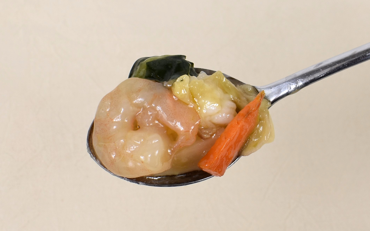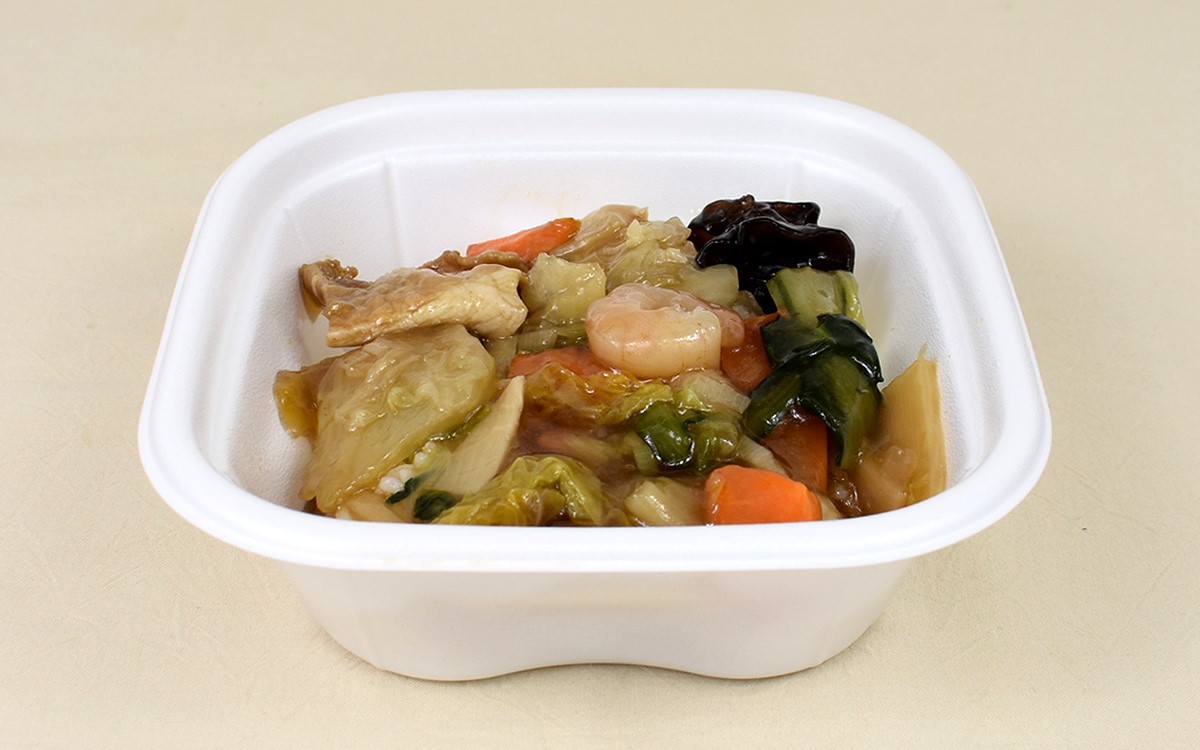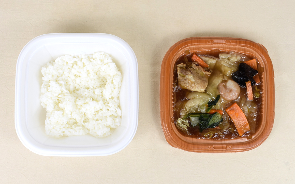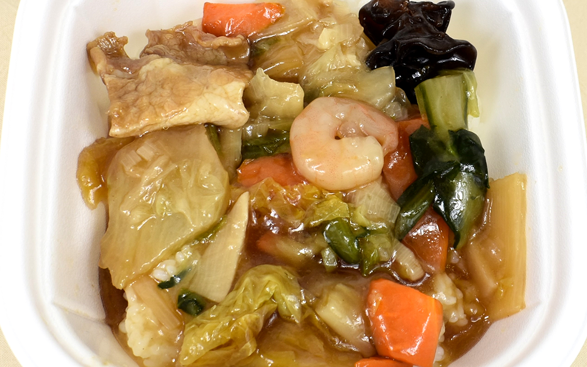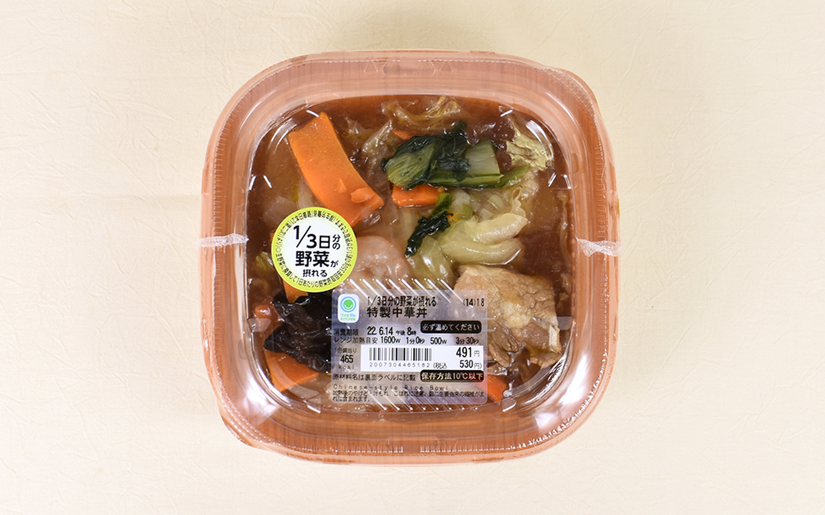 商品名の通り1/3日分(※生野菜に換算して1日あたりの野菜摂取目安350gの約1/3 :厚生労働省「健康日本21 第二次」より)の野菜を使った中華丼は、蒸し焼きの玉ねぎやにんじんを始め小松菜なども入っていて具だくさん。もちろん野菜以外に中華丼定番のゆでえびや豚肉炒めもトッピングされており、バリエーション豊かな味わいを楽しむことができます。