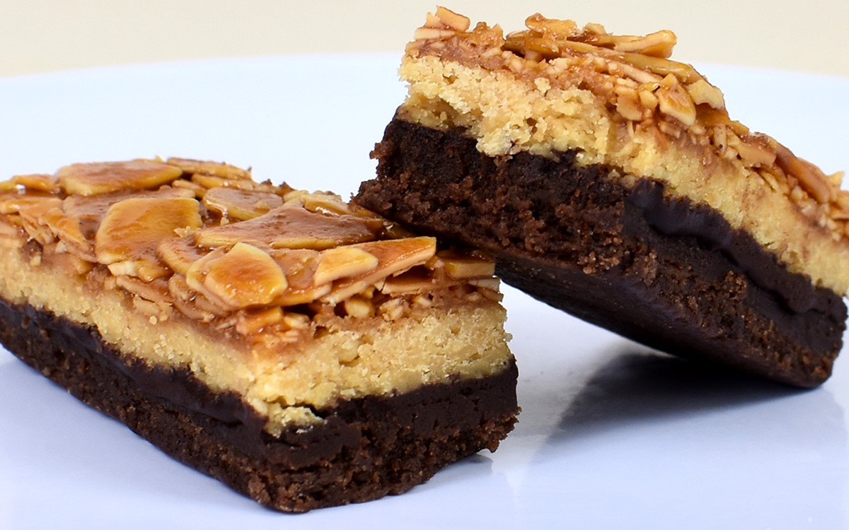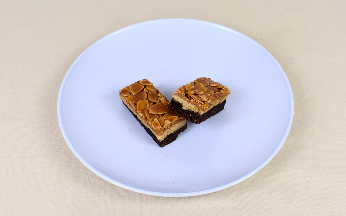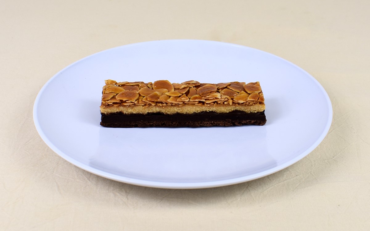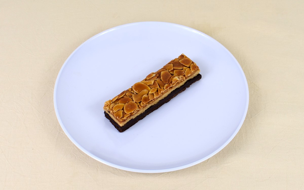 細長い長方形のチョコケーキにフロランタンを乗せた同商品。フロランタンとはフランスのスイーツで、サブレ生地にキャラメルコーティングしているアーモンドスライスなどのナッツ類を合わせた焼き菓子のことです。