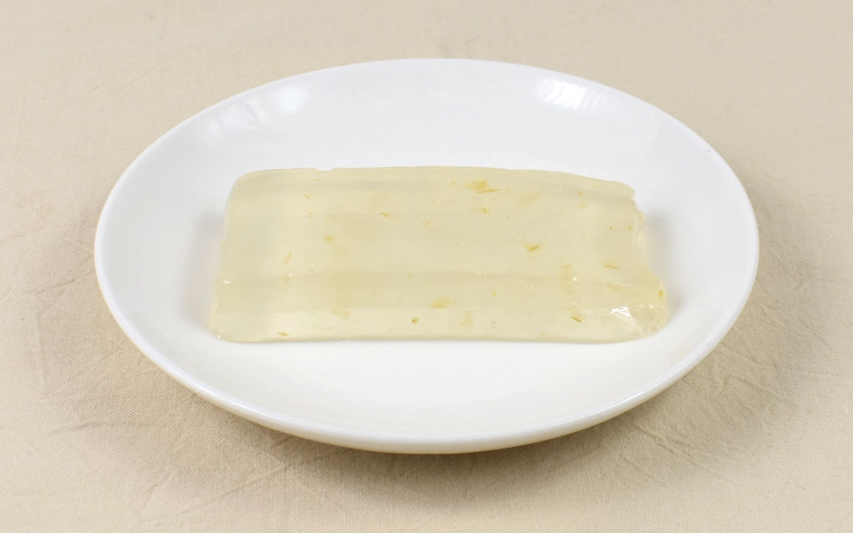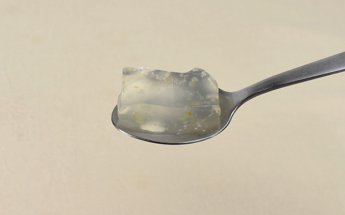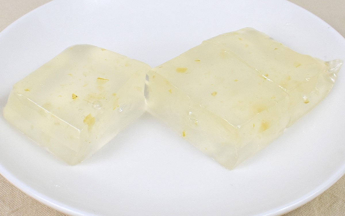 今回はお皿に盛りつけてみたところ、半透明のわらび餅が涼やかな外観で好印象。お餅の中につぶつぶと浮かぶ色鮮やかなレモンもきれいで、来客用に出すお菓子にするのもアリです。