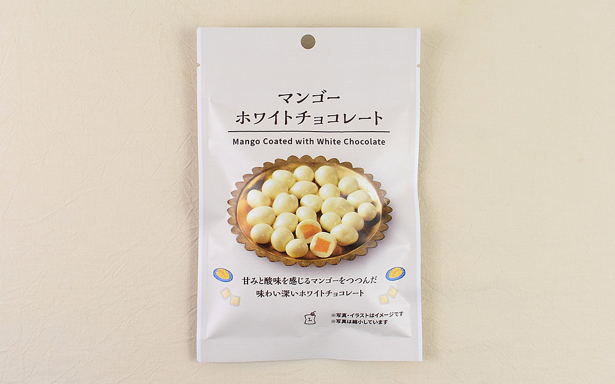 ホワイトチョコで糖漬け乾燥マンゴーを包み込んだ同商品。マンゴーを使うことで、ホワイトチョコの甘さに果物の酸味がプラスされてスッキリした後味のスイーツに仕上がっています。