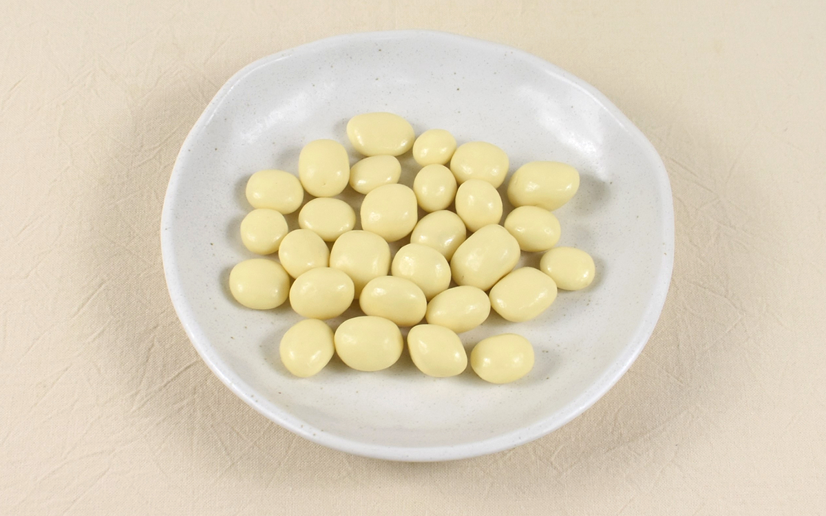 ホワイトチョコの大きさは指先程のサイズ感でかなり小粒。パクっと一口で食べられるので、作業中のおやつにもぴったりです。また粒は小さいものの、50g分のホワイトチョコが入っているため個数は多め。自分用のお菓子としてはもちろん、友達が遊びに来た際にシェアして食べるのもオススメですよ。