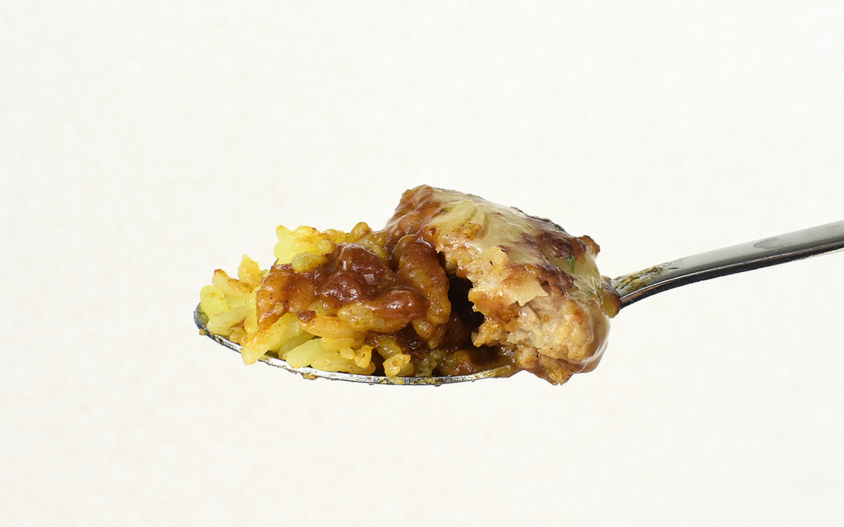 電子レンジで加熱(目安時間 500Wで4分)してからフタを開けると、こうばしいカレーの香りがふわり。トロトロに溶けたナチュラルチーズの美しい輝きに加え、焼き目が垣間見えるハンバーグにも心を鷲掴みにされます。さっそくハンバーグからいただいたところ、肉の旨味が口の中で大爆発。奥深い味わいが後を引き、たった一口で「この商品を選んで大正解」と思えました。