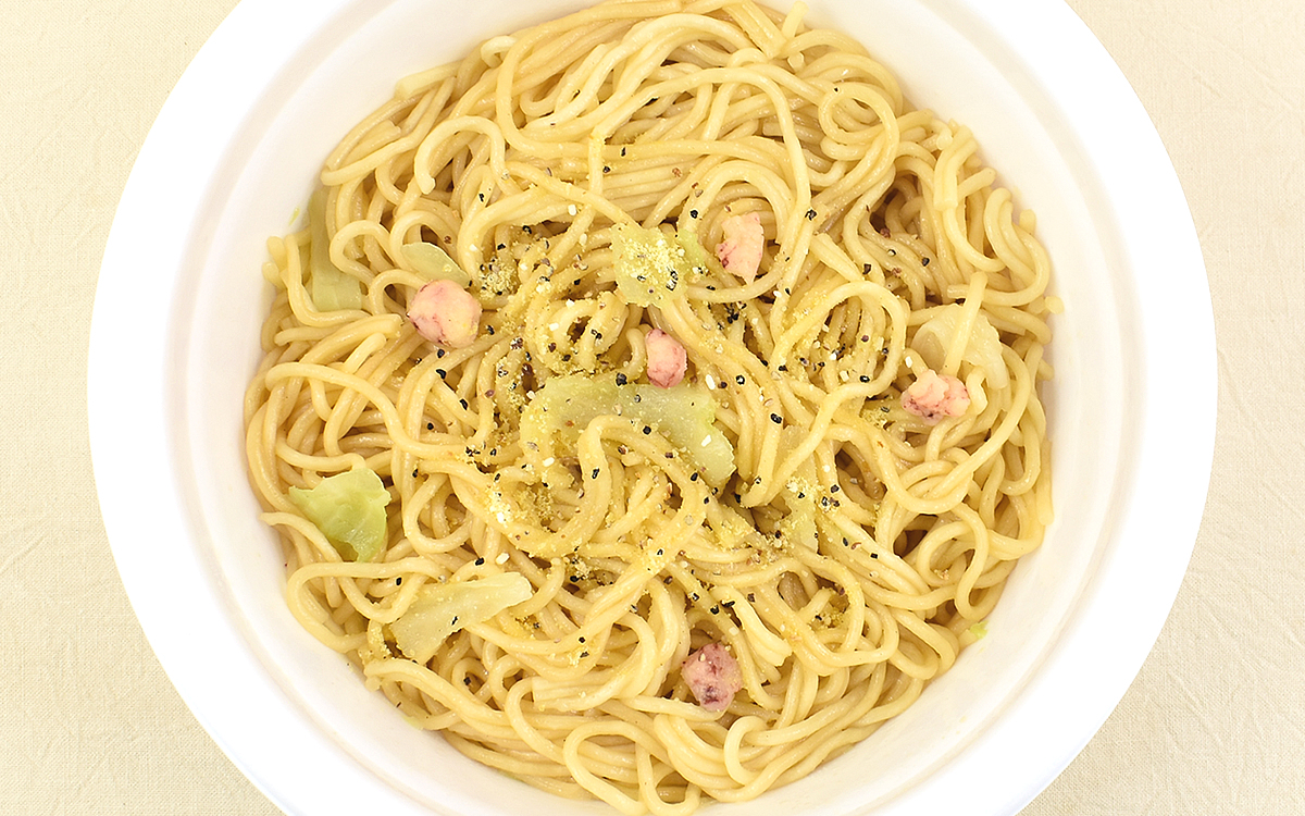 「濃い濃いシーフード」のパッケージを開封すると既にかやくが入っていて、液体ソースの他に「特製レモンペッパー レモンピール入り」と記された小袋が。「焼そばにレモンって合うの?」と思いながらかき混ぜて一口いただいたところ、これが大正解! ソースに絡むレモンの香りとさわやかな酸味に驚かされます。