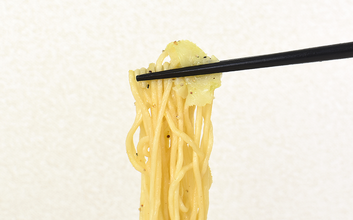 具材はキャベツとイカ風味ボールのみ。とはいえキャベツからにじみ出る野菜の甘みが酸味とマッチして、さわやかな香りを一層引き立たせてくれます。またコロっとしたかたちのイカ風味ボールは、シーフードソースを吸収して深みを増した味わいがGOOD。肝心要の麺には中太ストレート麺が使われていて、噛むごとに弾力ともっちり感を楽しめました。