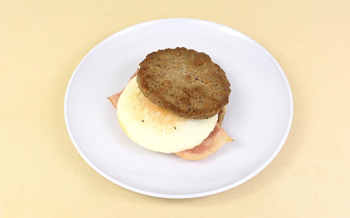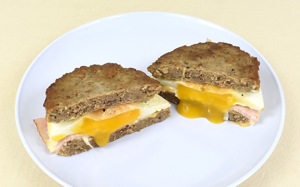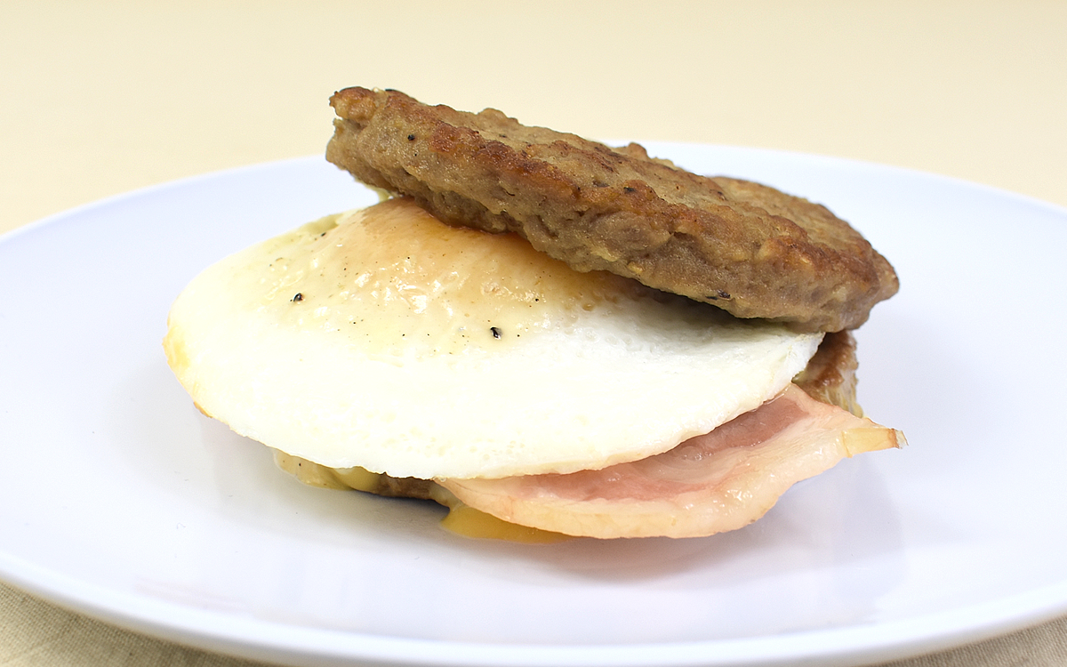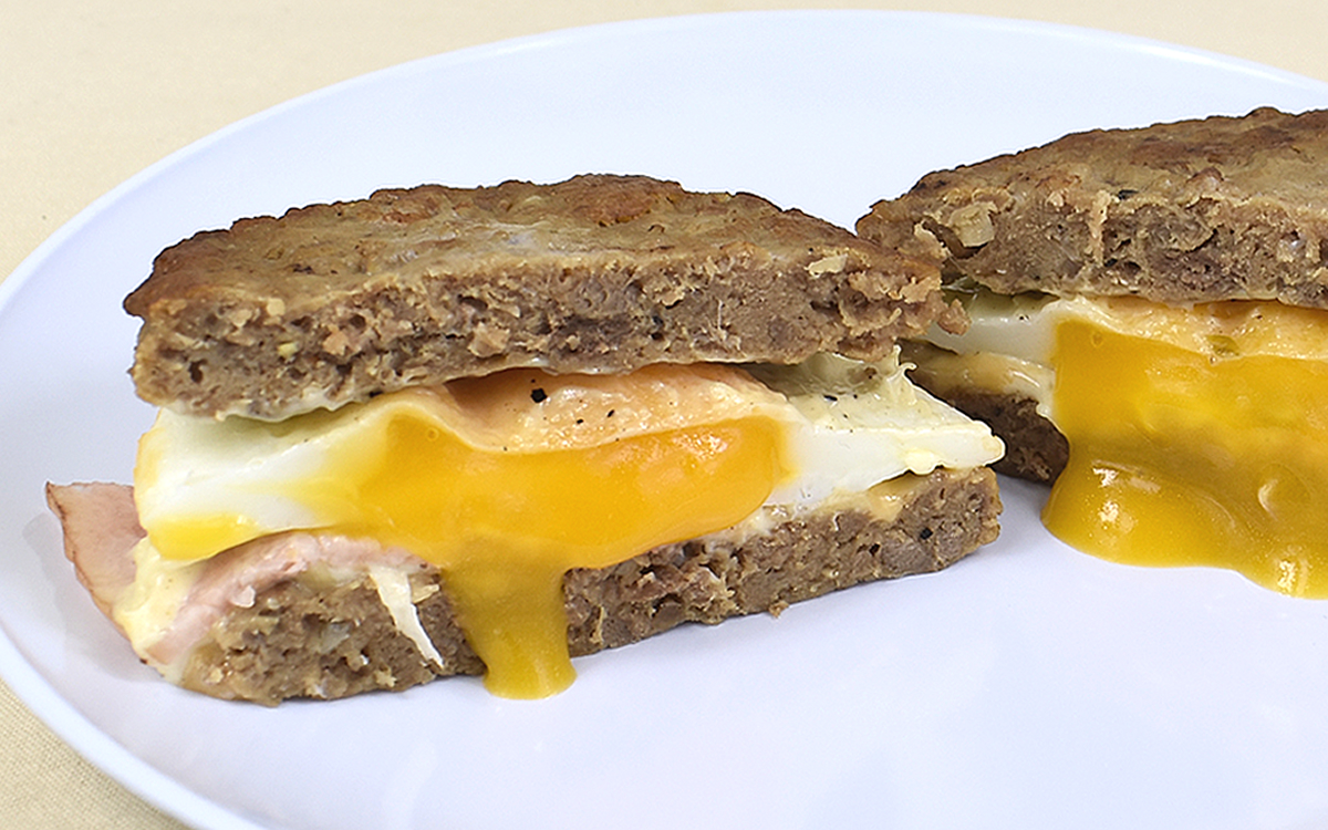 バンズ代わりにパティで具材を挟むという肉感満載のバーガーですが、その魅力は肉の旨味だけではありません。圧倒的存在感を放つパティ&ベーコンのタッグに負けていないのが、目玉焼き風のオムレツ。かじりつくと同時に黄身がとろりとあふれ出てきて、コクがプラスされることに。ふんわり仕上げられた白身のなめらかな口あたりもGOODです。