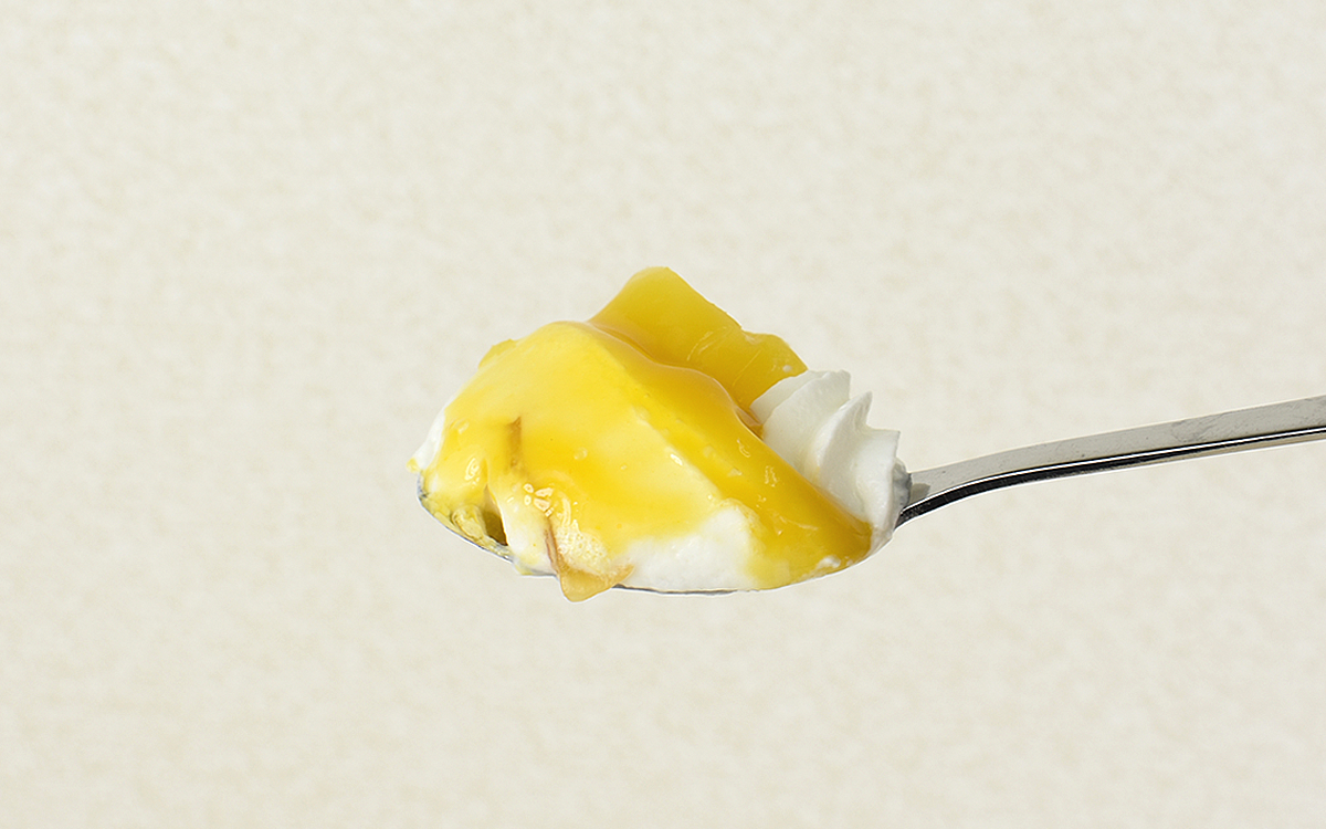 スプーンを深く入れると、ムースと角切りゼリーのゾーンに到達。ムースを口に含めるとヨーグルトの風味が広がり、口の中に残っていたマンゴーの酸味に重なることでさわやかな後味がもたらされました。